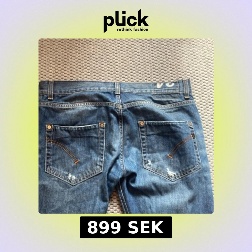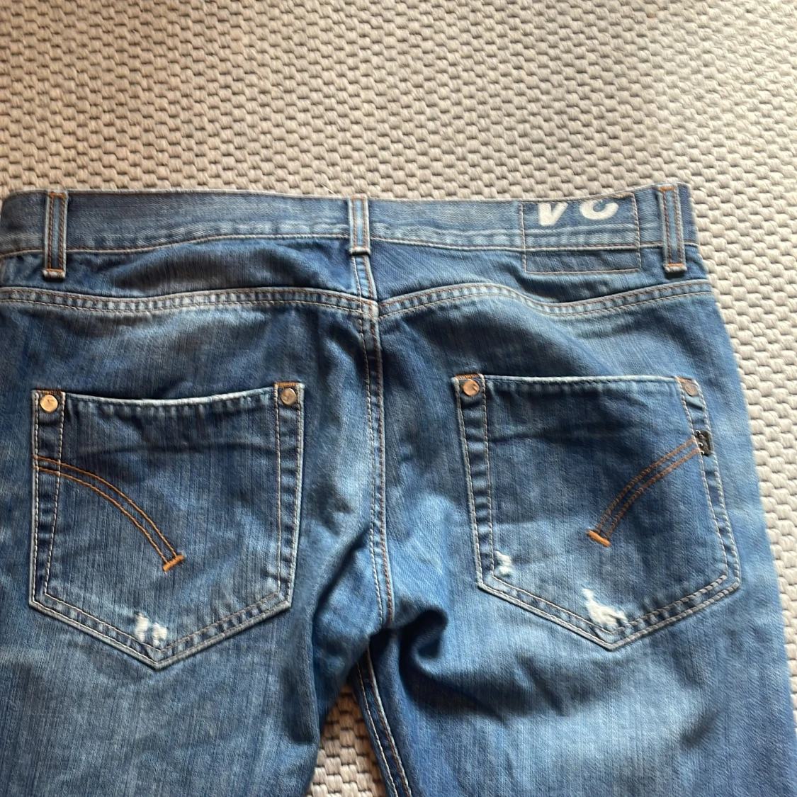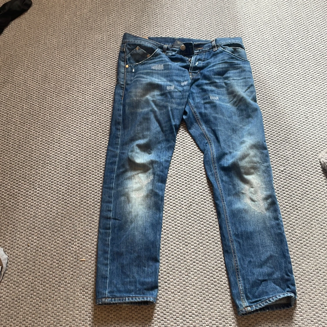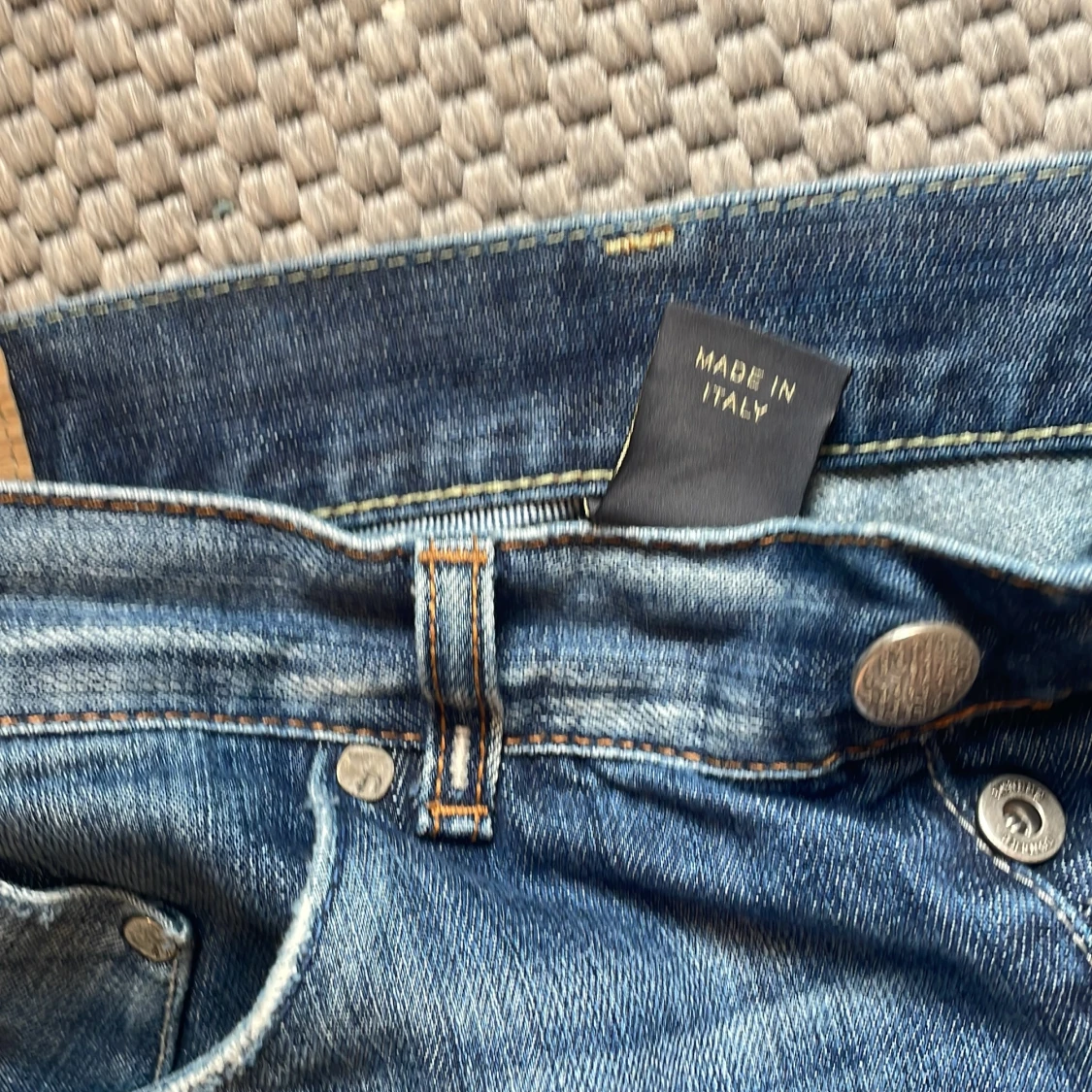 Säljer ett par blå jeans med snygga slitningar och kontrastsömmar. Jeansen är tillverkade i Italien och har klassisk femficksdesign med raka ben. Materialet är jeans med en cool tvätt och detaljer på bakfickorna.