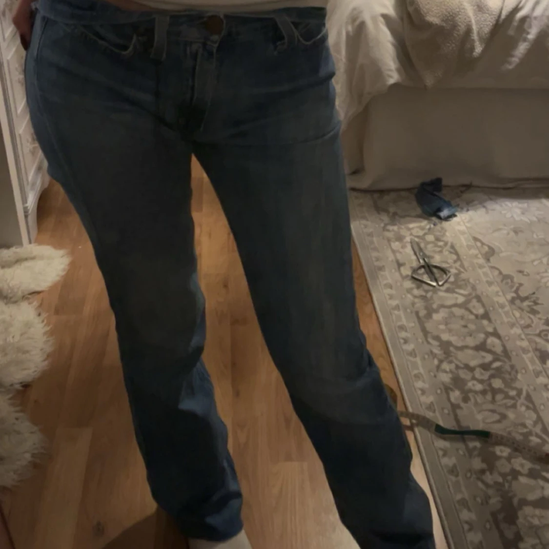Snygga blåa vintage jeans med klassisk design och normal passform. Perfekta för en avslappnad stil. De har en traditionell femficksmodell och stängs med dragkedja och knapp. jeansen är i fint bra skick men har en liten skada där skärp ska sitta (kan fixas) och en påsydd lapp mellan benen men inget som synd. passar någon som har 34/36❤️midjemått 37, innerbenslängd cirka 77/78