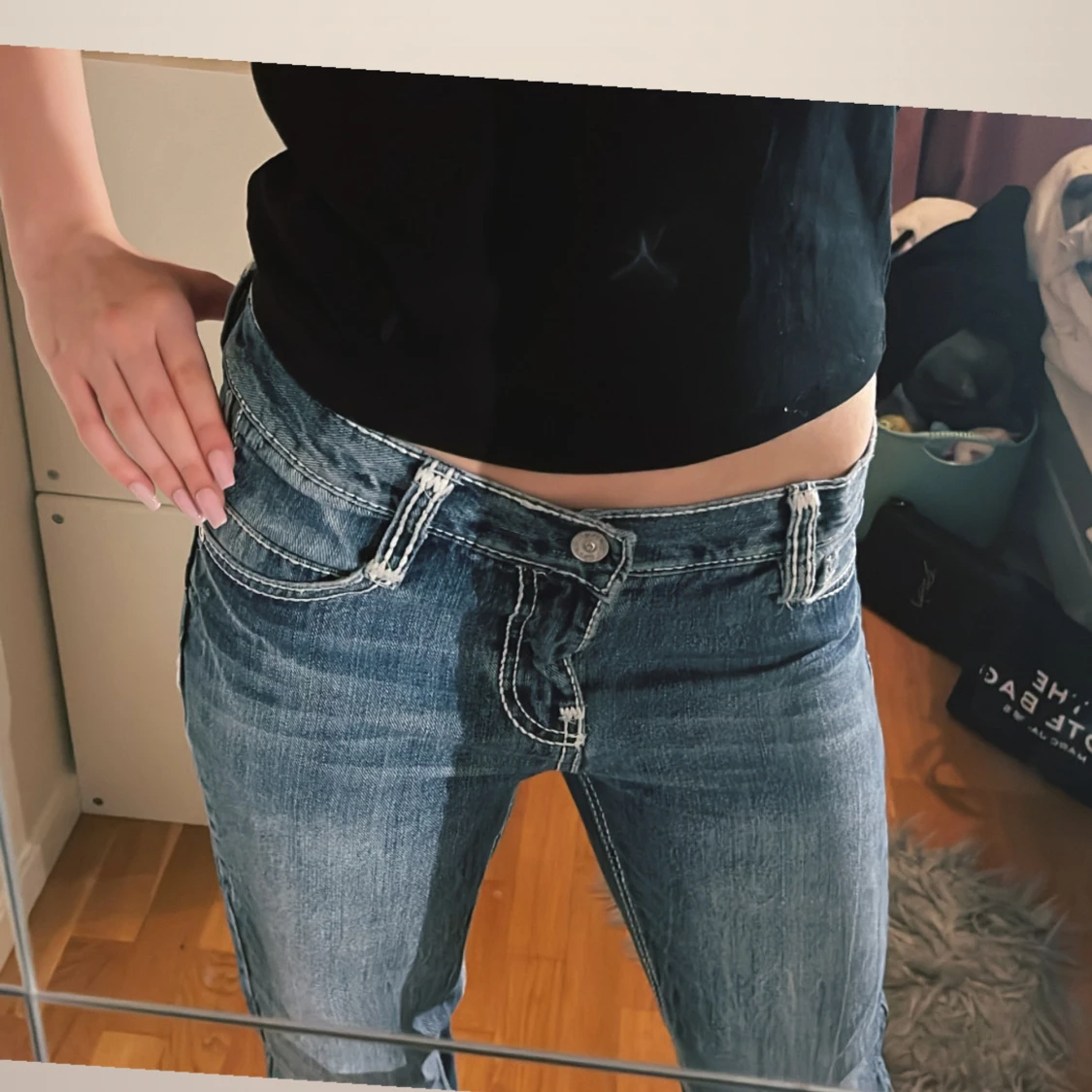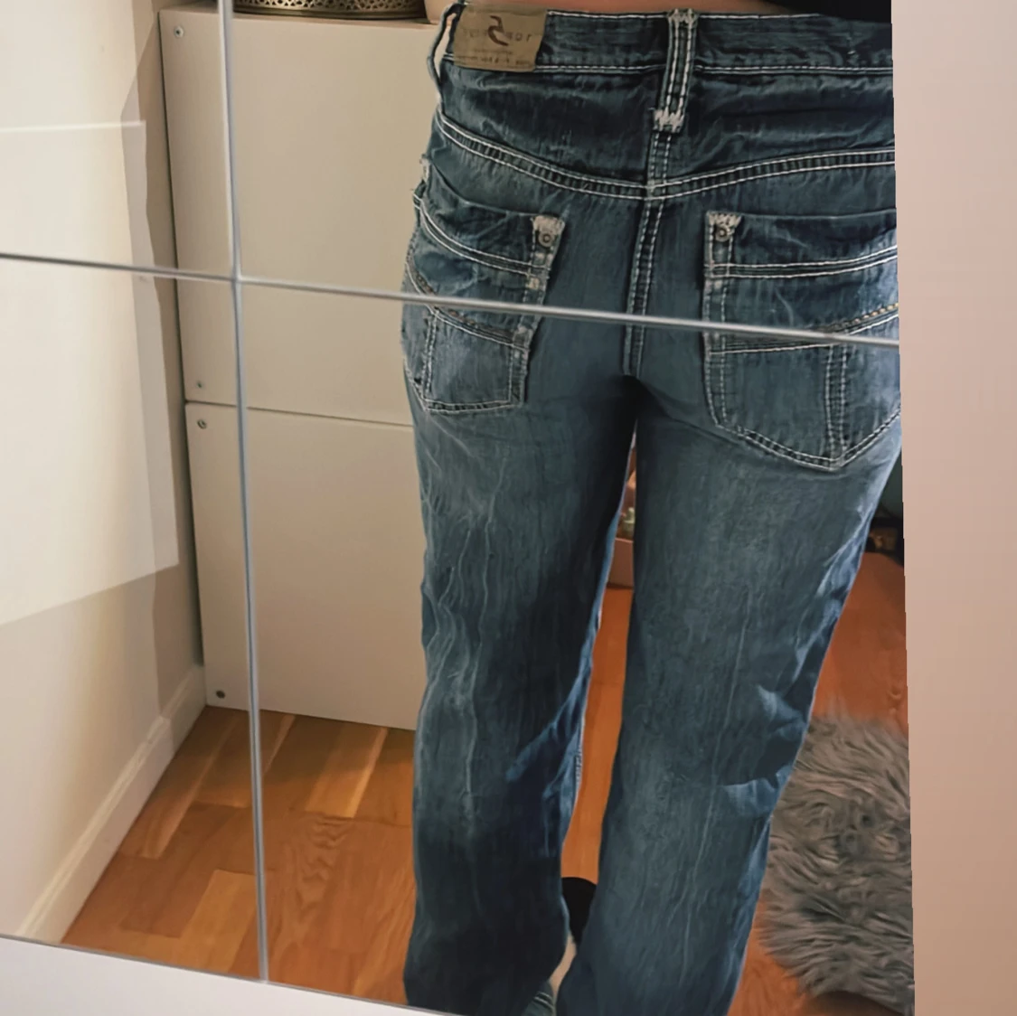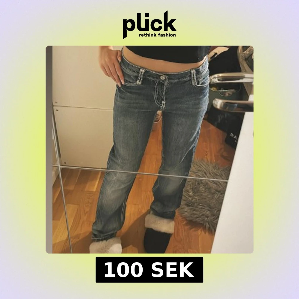 Säljer ett par blå jeans med vita sömmar och fina fickor. Strl 164 och passar mig som har xs 💓
