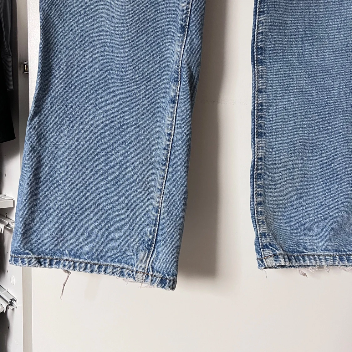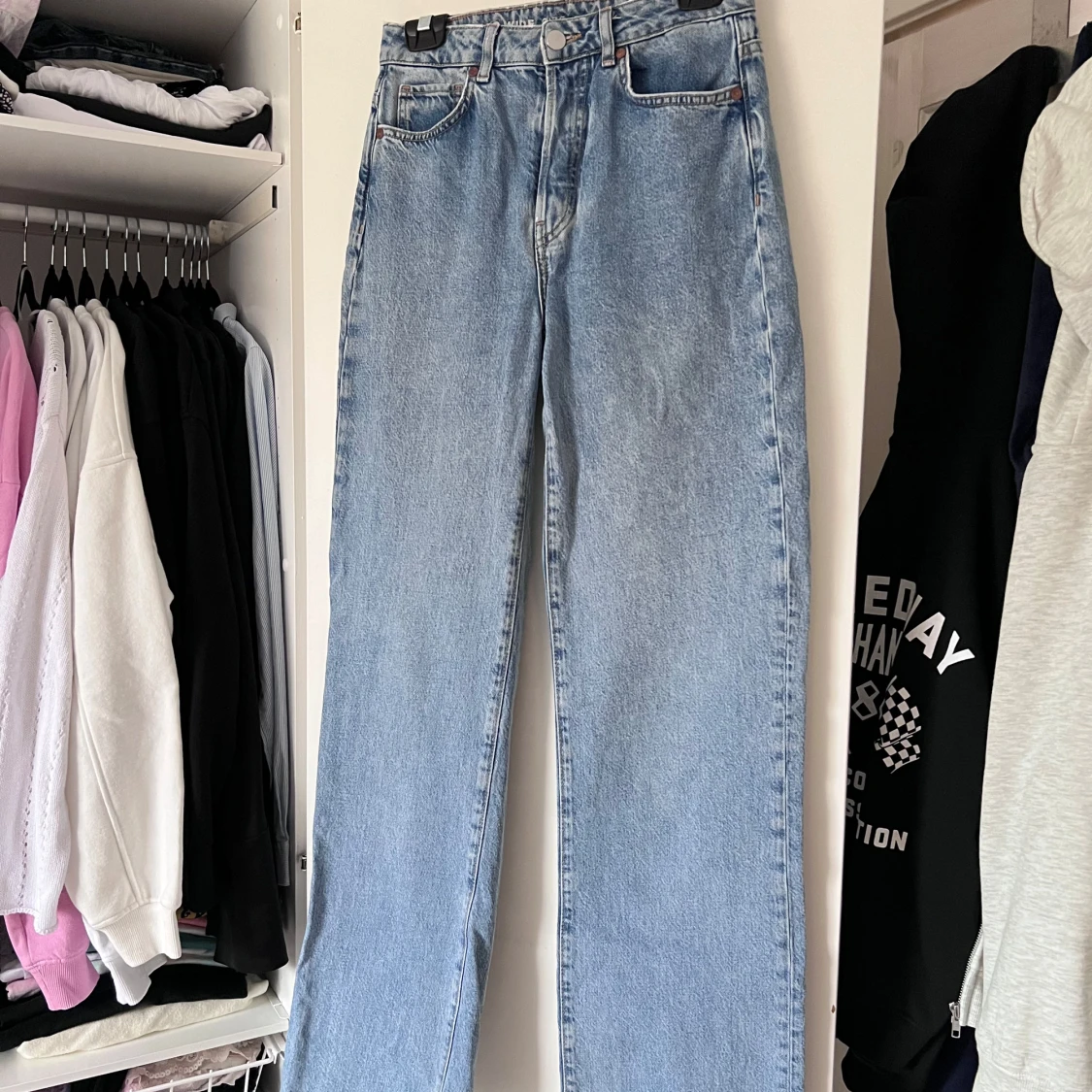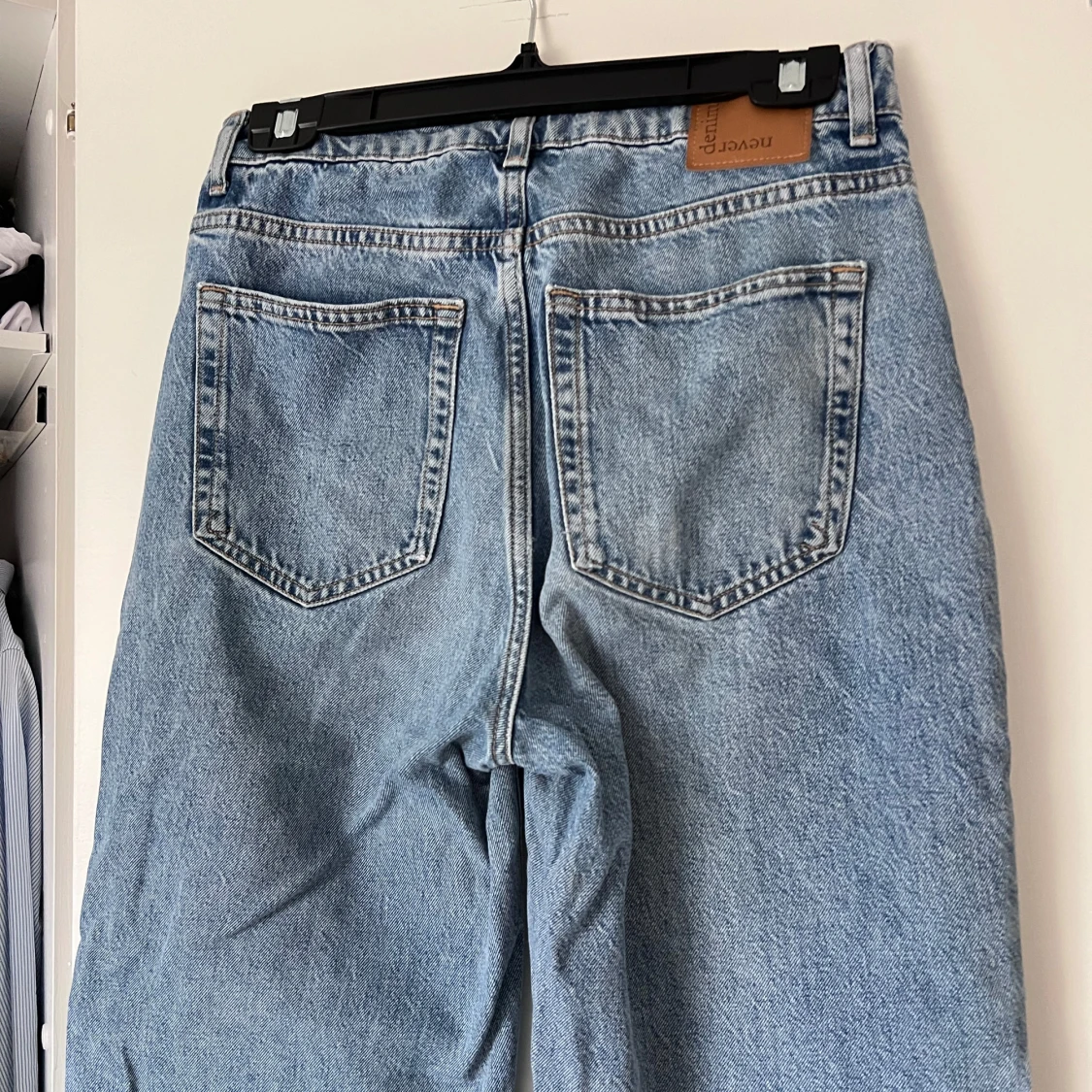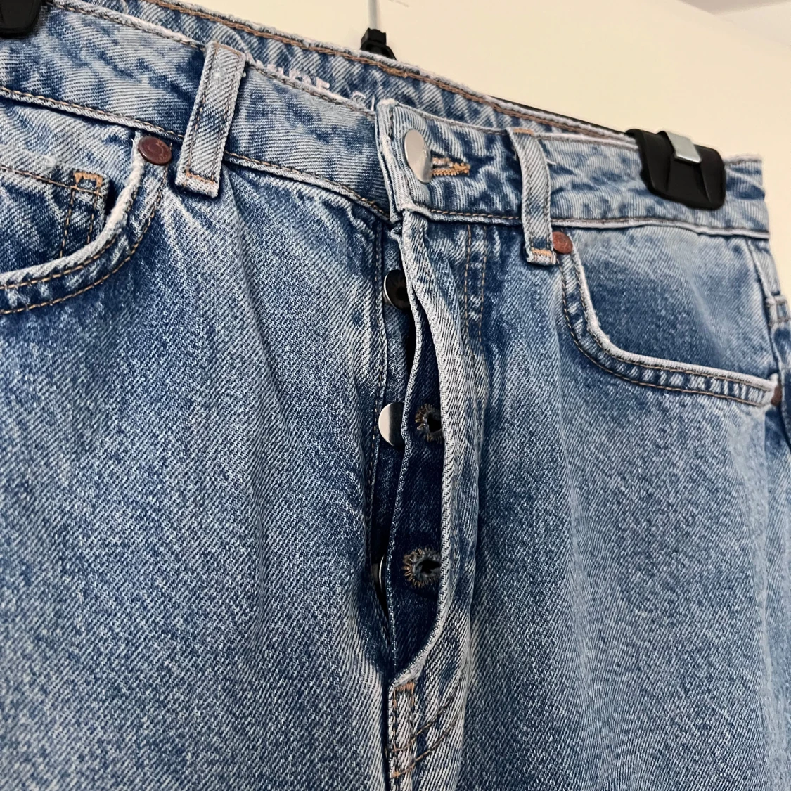 Snygga blå jeans med hög midja och rak passform. Klassisk femficksdesign med knapp och dragkedja framtill. Perfekta för en avslappnad stil. Använda 1 gång! Önskar du veta exakta mått? Tveka inte att höra av dig!