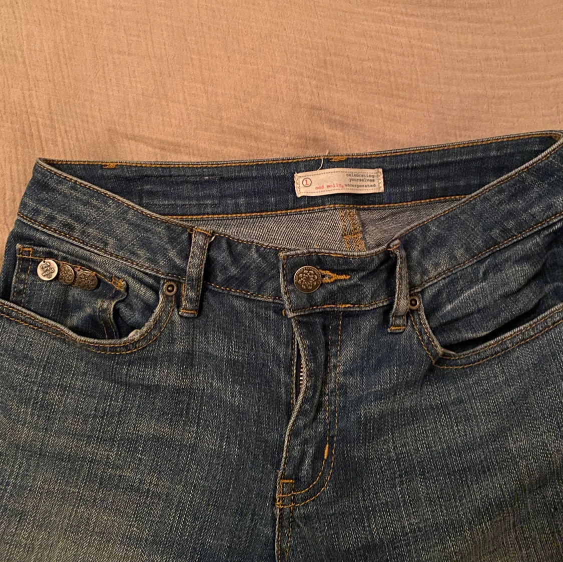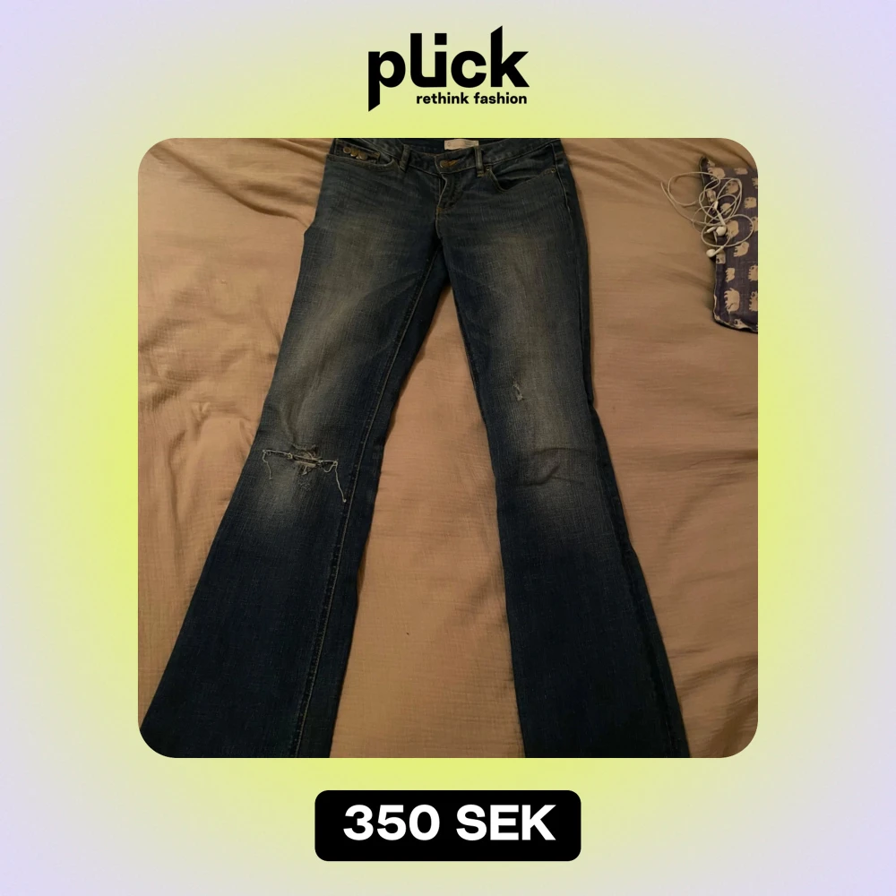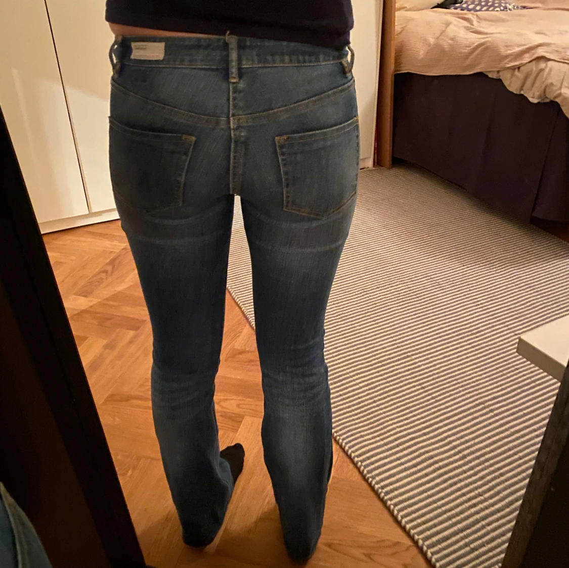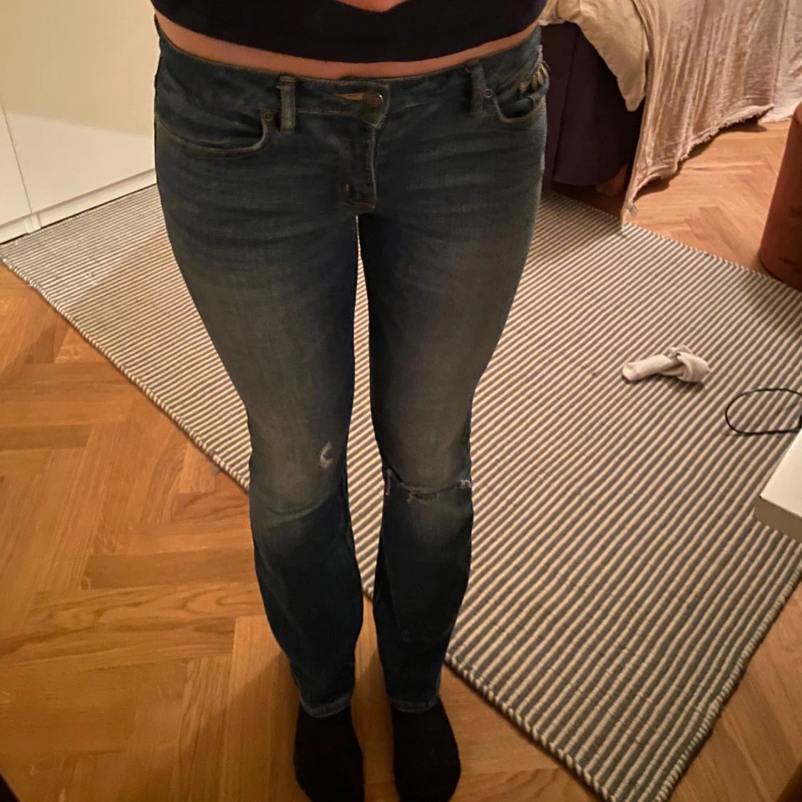 Säljer ett par snygga blå jeans i bra skick. De har en tight passform och är logmidjade. Jeansen har en klassisk femficksdesign och är perfekta för både vardag och fest. De har en liten slitning på ena benet och detaljer vid fickorna.