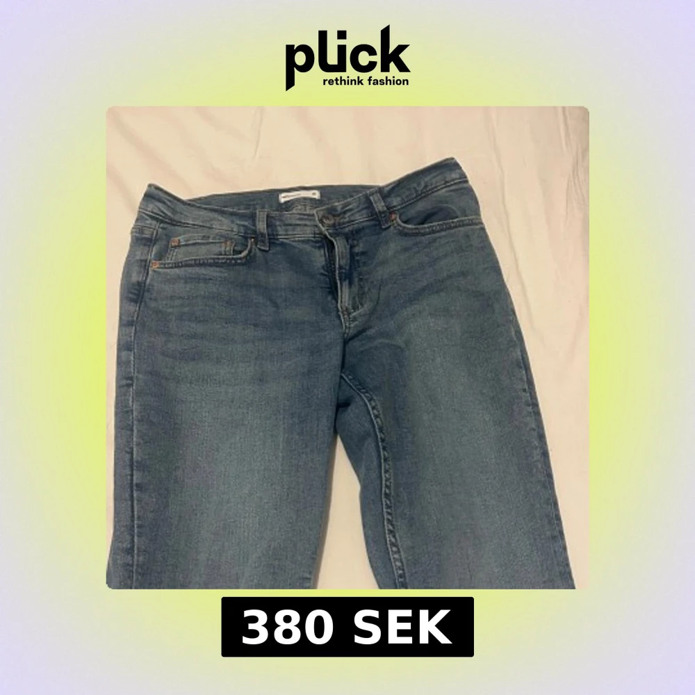 Snygga blå jeans med klassisk design. De har en rak passform och femficksmodell med knapp och dragkedja framtill. Perfekta för en avslappnad stil. Utsvängda nedtill, och sitter bra. Använda 1 gång, nypris 499kr