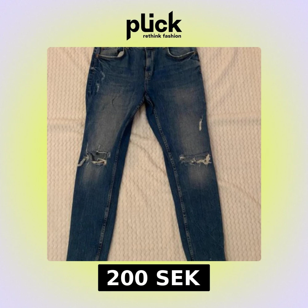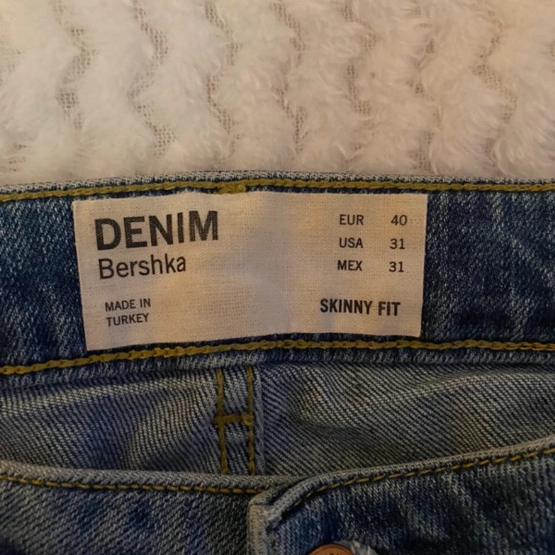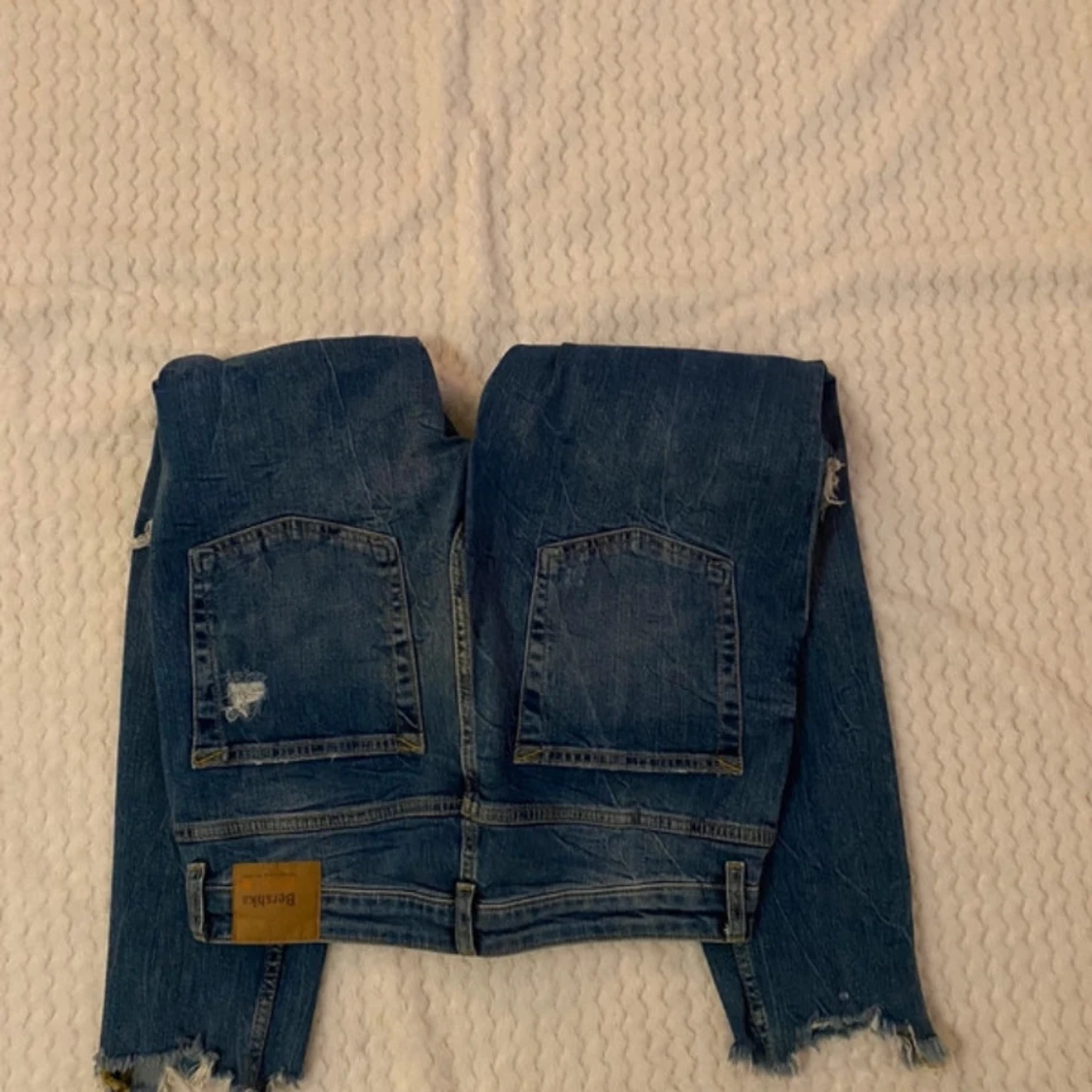 Säljer ett par blå jeans från Bershka med slitna detaljer på knäna och fransiga benslut. Perfekta för en trendig look. Tillverkade i Turkiet.