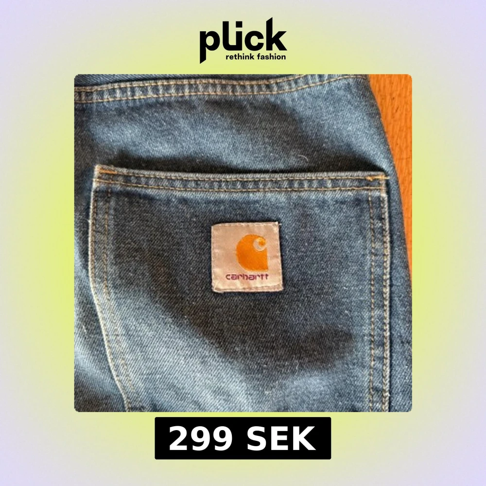 Säljer ett par klassiska blå jeans från Carhartt. De har en rak passform och är tillverkade i slitstarkt denim. Byxorna har fem fickor och en knappgylf. Perfekta för en avslappnad stil. Storleken säger M, den passar mig som vanligtvis har 32/32.