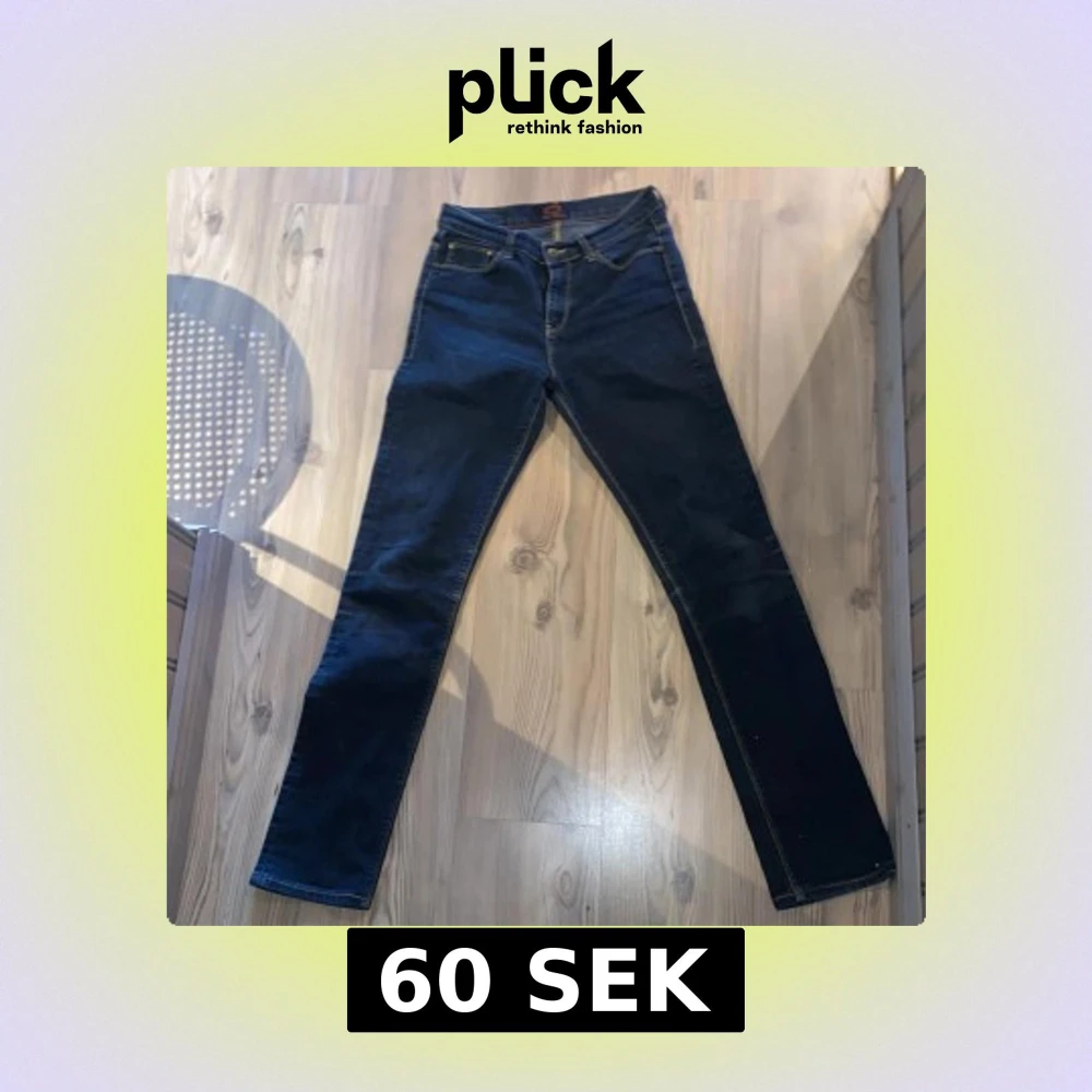 Snygga blå jeans från Crocker med klassisk design och gul söm. De har en knapp och dragkedja framtill samt fem fickor. Perfekta för en avslappnad stil.
