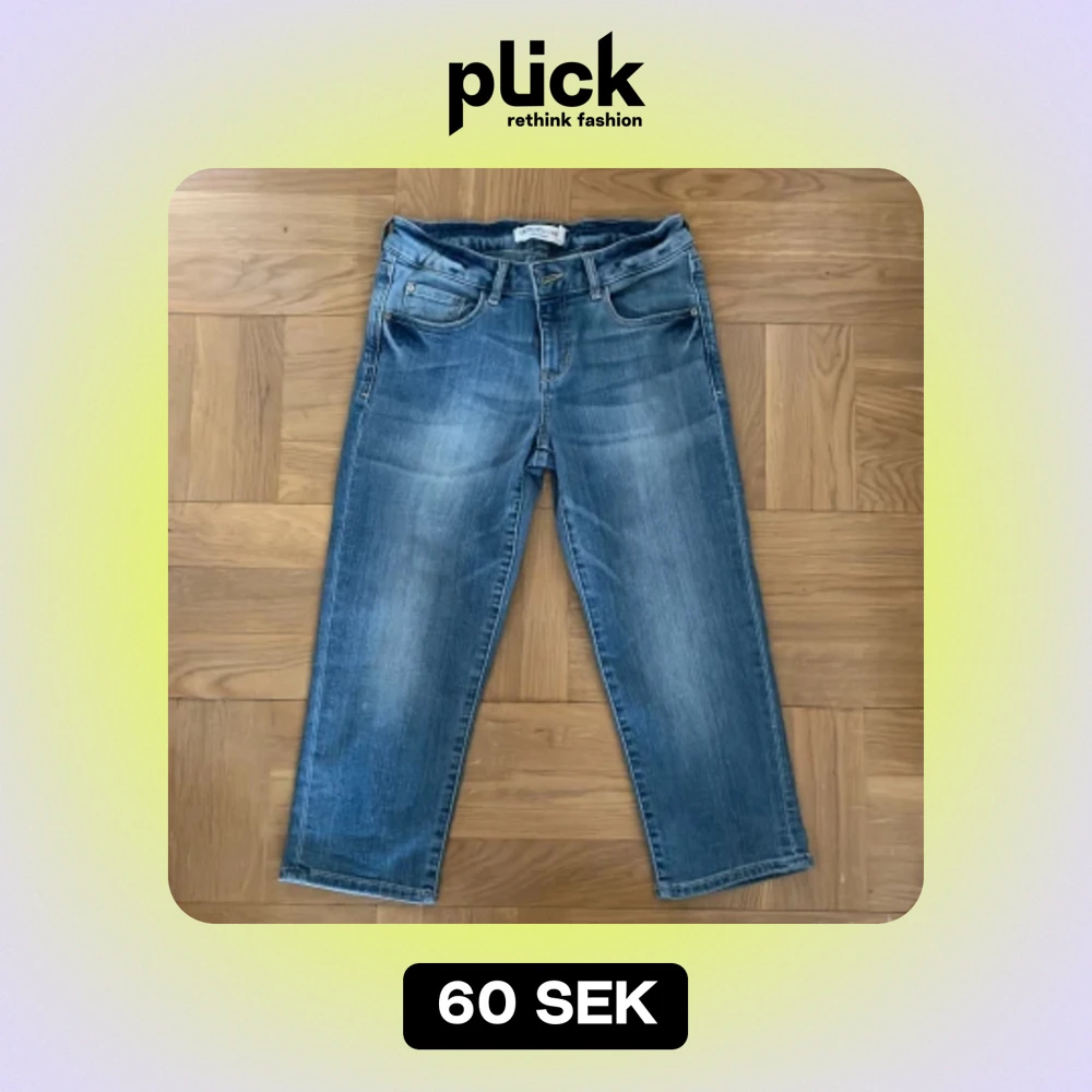 Ett par blå trekvarts-långa jeans från Detroit by Lindex i storlek 158. Jeansen har en klassisk femficksdesign och är tillverkade i denim. De har en knapp- och dragkedjestängning framtill.