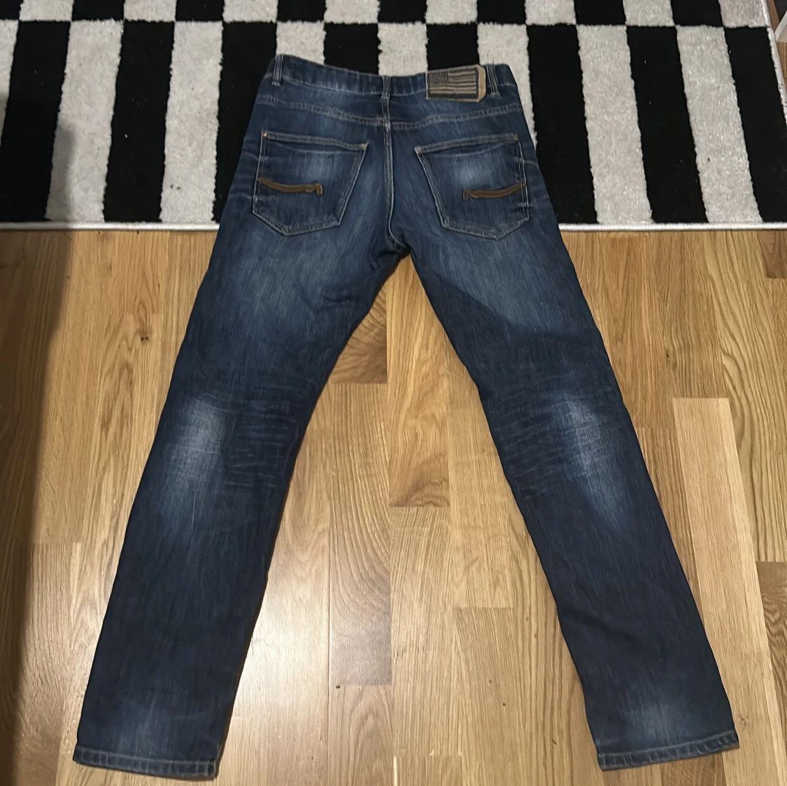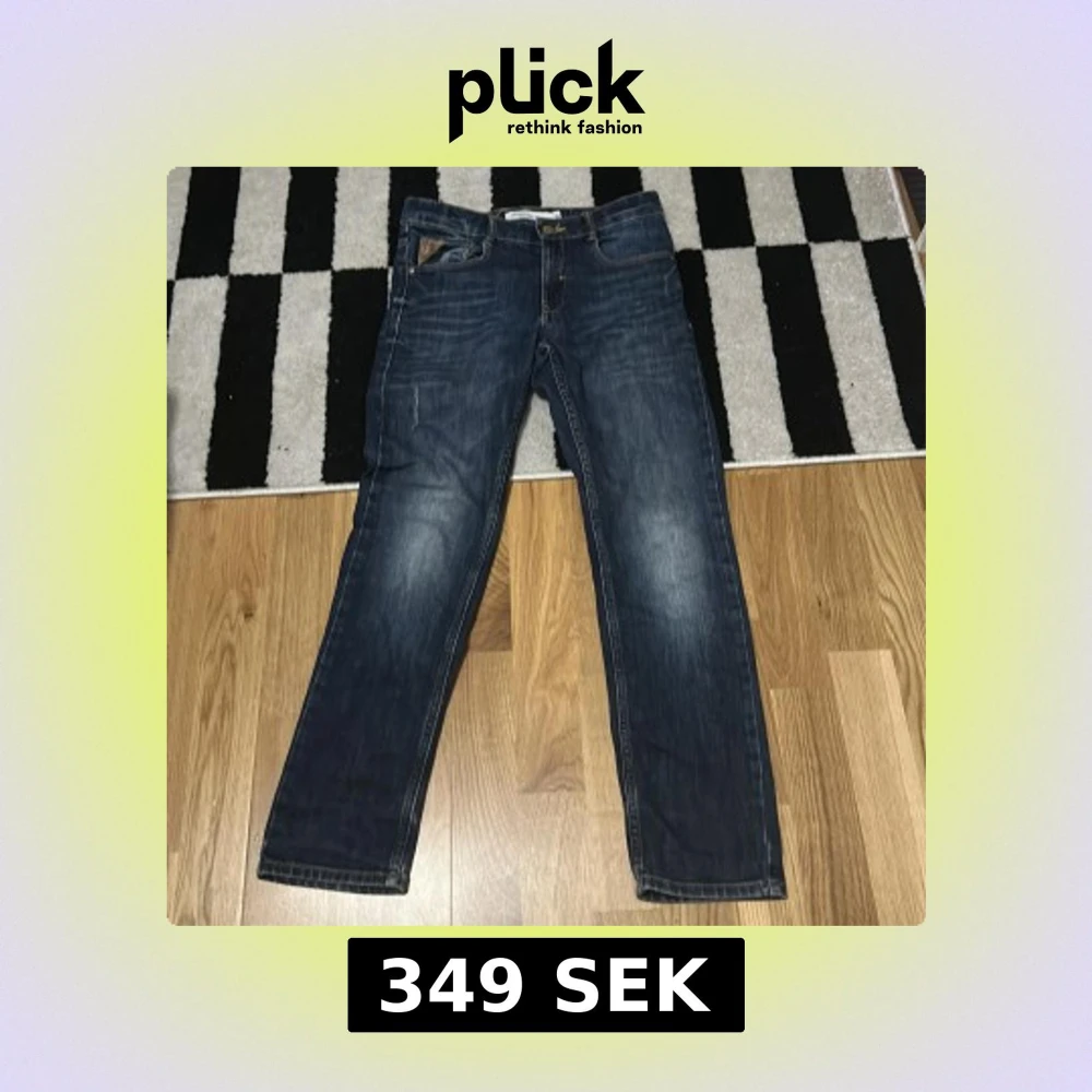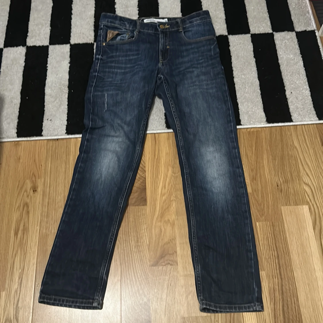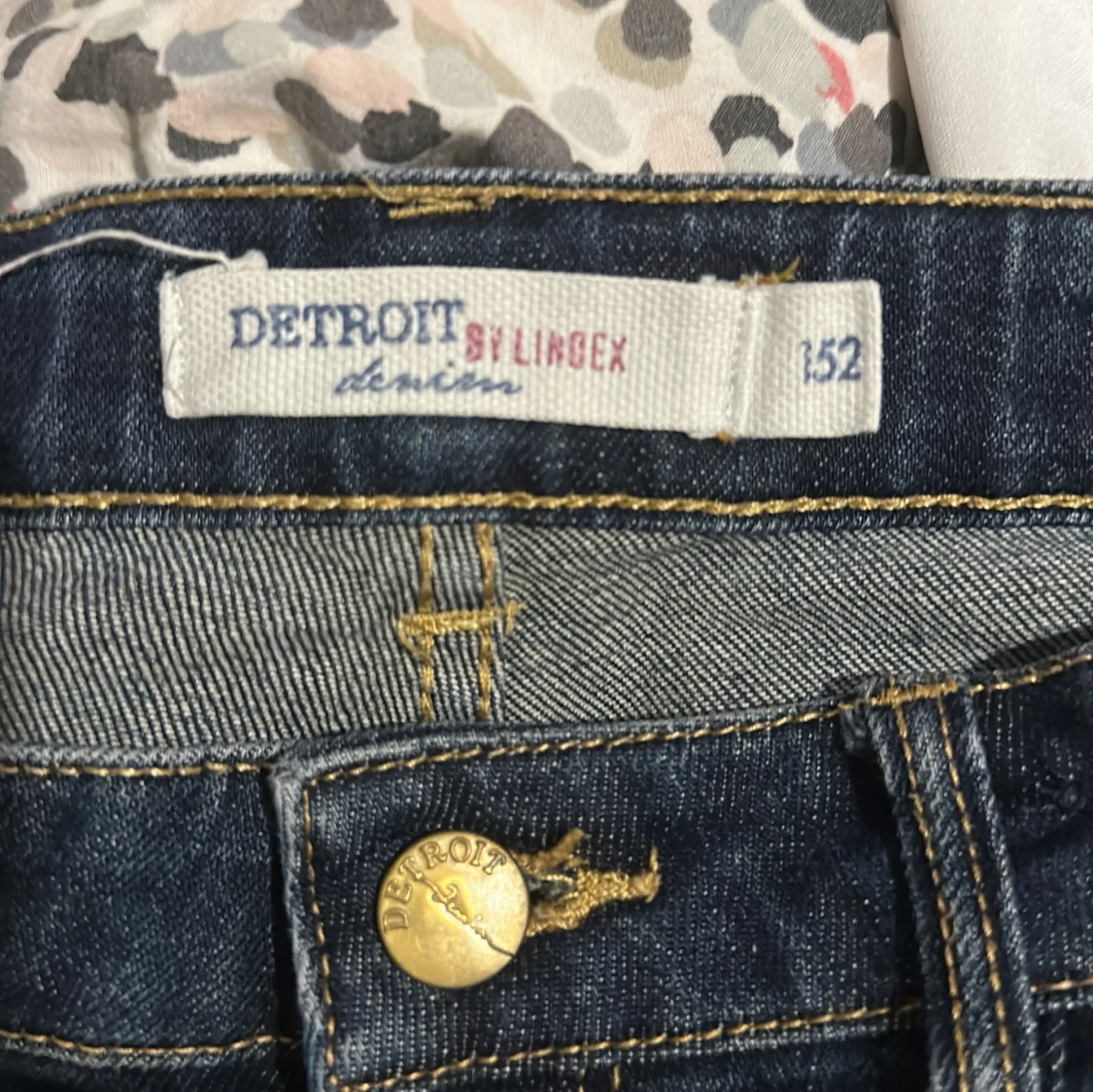 Säljer ett par klassiska blå jeans från Detroit Stylingex i storlek 152. Jeansen har raka ben, snygga slitningar och kontrastsömmar. De har fem fickor och detaljerade bakfickor med dragkedjor. Perfekta för en avslappnad och cool look.