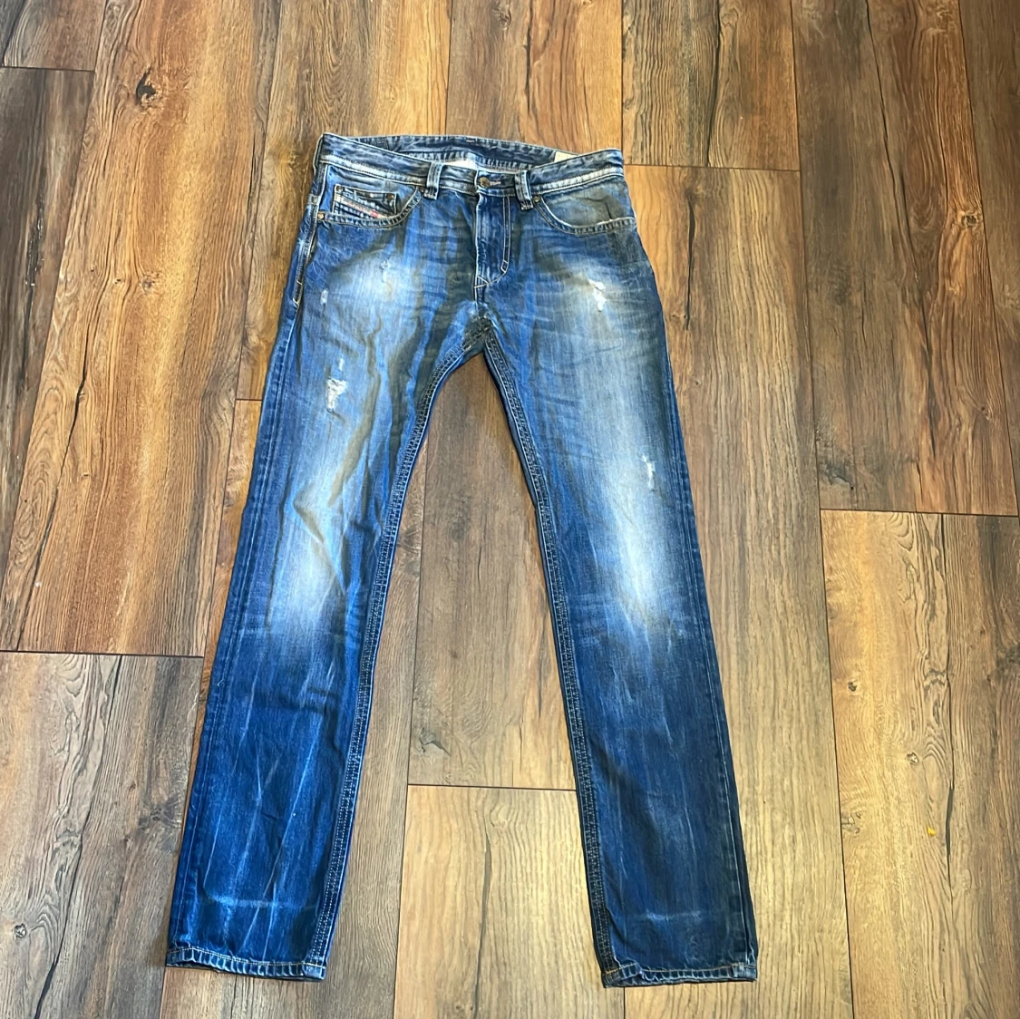 Snygga blå jeans från Diesel med klassisk femficksdesign och slitna detaljer. Jeansen har raka ben och tydliga kontrastsömmar. Perfekta för dig som gillar en avslappnad och tidlös look. Billiga på grund av att den har blivit ett lite hål på dem