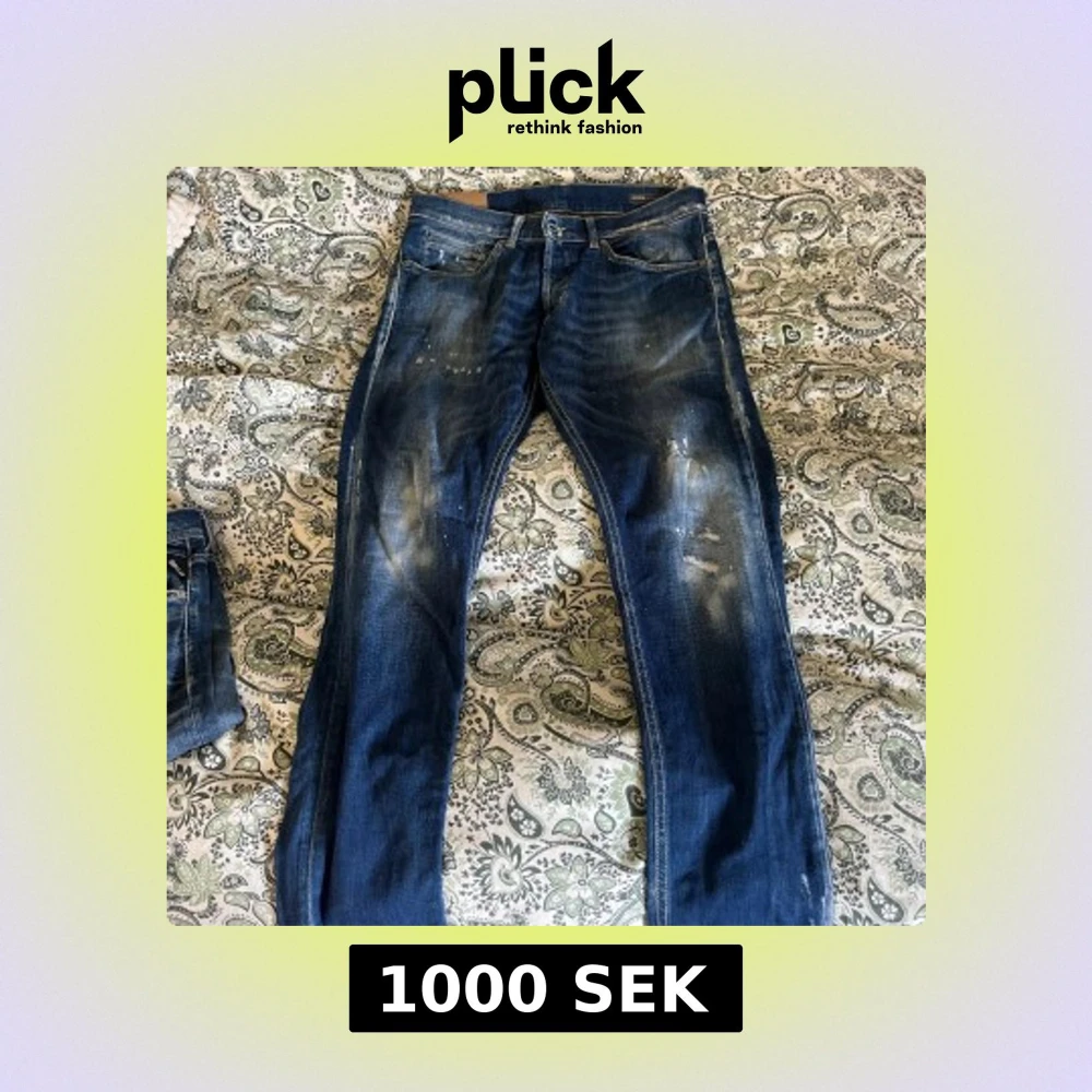 Säljer ett par snygga blå jeans från Dondup med slitna detaljer och en klassisk femficksdesign. Jeansen har en normal passform och är tillverkade i denim med en lätt tvättad look. Perfekta för en avslappnad stil.
