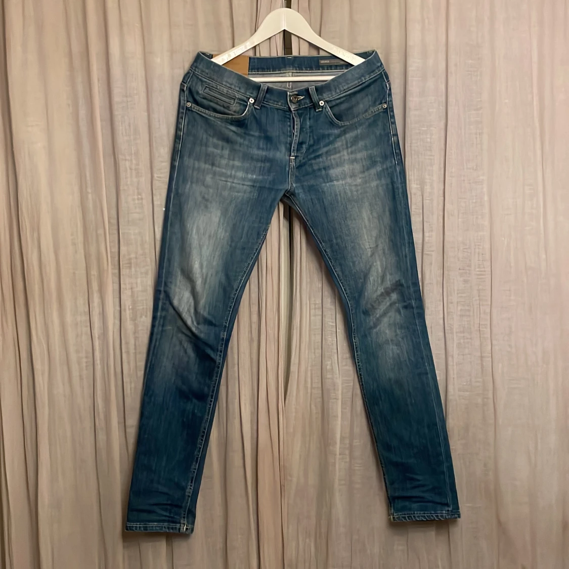 Snygga blå jeans från Dondup med en klassisk femficksdesign. De har en normal passform och är tillverkade i mjukt denim. Perfekta för en avslappnad stil. Jeansen är lagade i skrevet men ingenting som syns under användning. Passar 180-190cm
