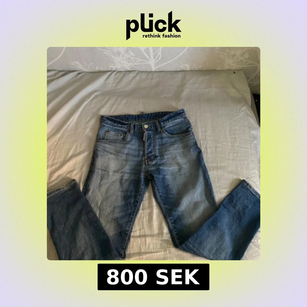 Säljer ett par klassiska blå jeans från Dsquared2 med snygg tvätt och raka ben. Jeansen har fem fickor, knappgylf och tydliga slitningar för en cool look. Liten Dsquared2-logga vid fickan och patch bak.