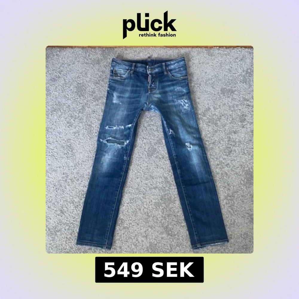 Snygga blå jeans från Dsquared2 med slitna detaljer och en cool look. De har en klassisk femficksdesign och en knappgylf. Perfekta för en avslappnad stil med en touch av edge. Storlek 40: passar folk runt 160-170 cm. Slim fit. Finns o hämta i Halmstad. Den som köper får med en överraskning i paketet, kan vara ett armband eller något liknande