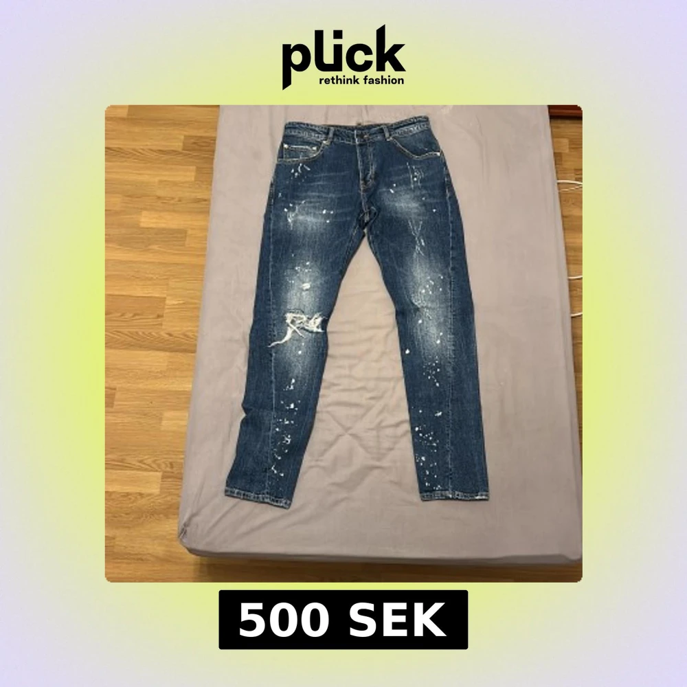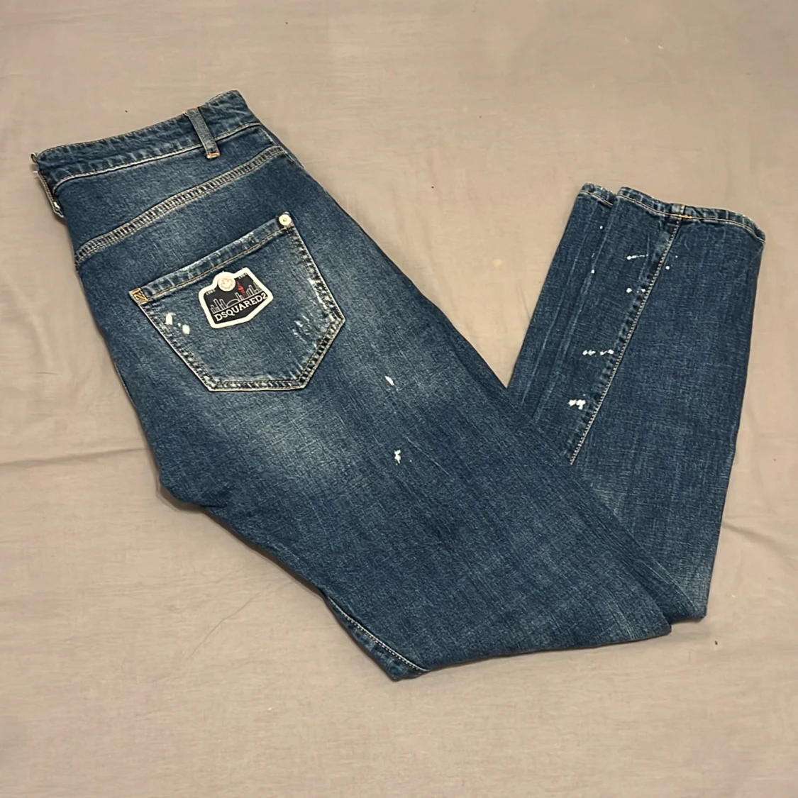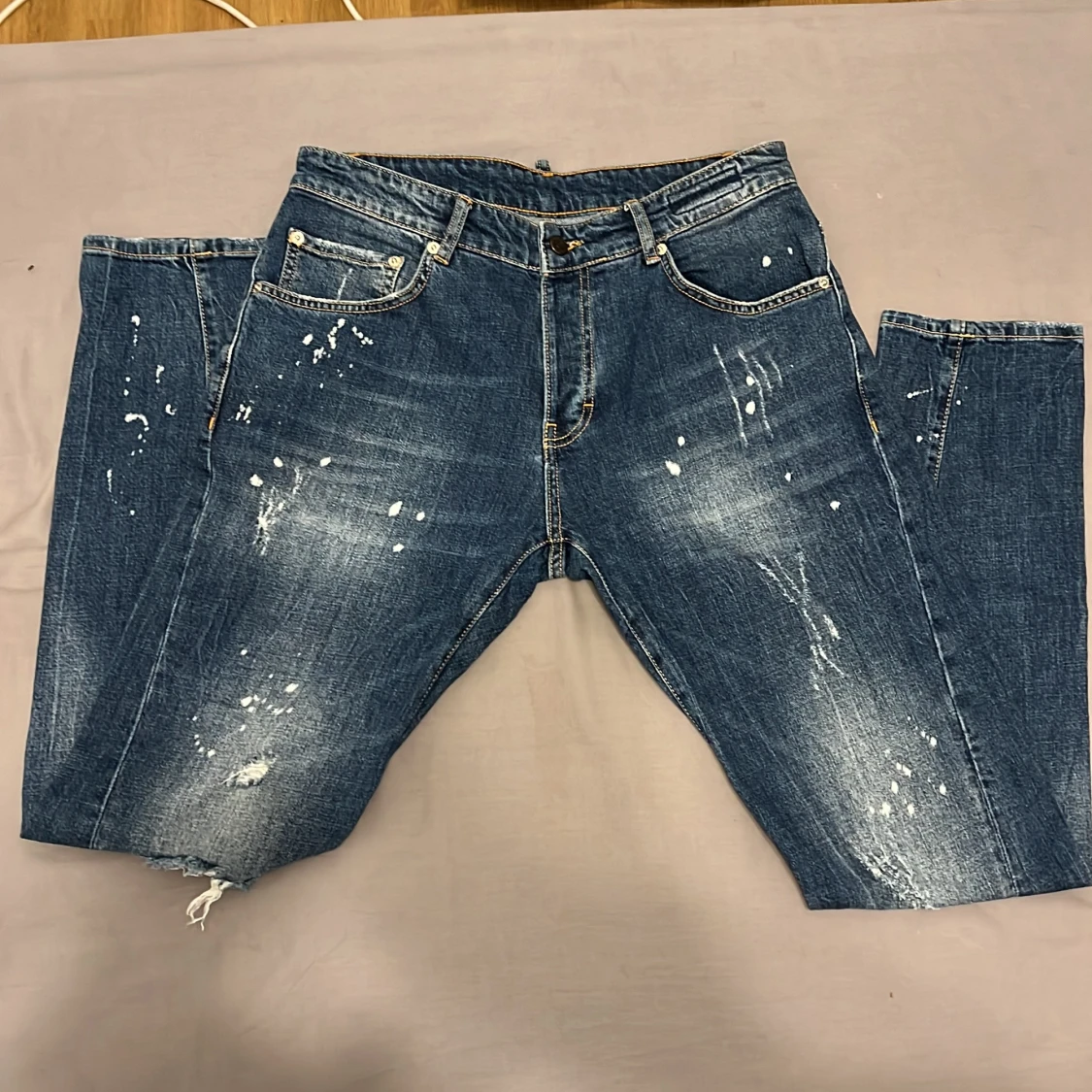 Snygga blå jeans från Dsquared2 med slitna detaljer och färgstänk för en cool look. De har en klassisk femficksdesign och knappgylf. Perfekta för en avslappnad stil med en touch av edge.
