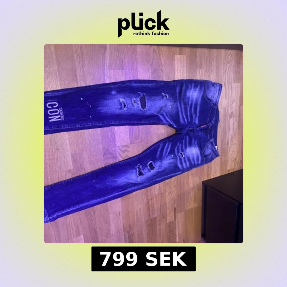 Snygga blå jeans från Dsquared2 med slitna detaljer och broderi på bakfickan. De har en röd läderetikett med logotypen och texten 'ICON' på framsidan. Perfekta för en trendig look.