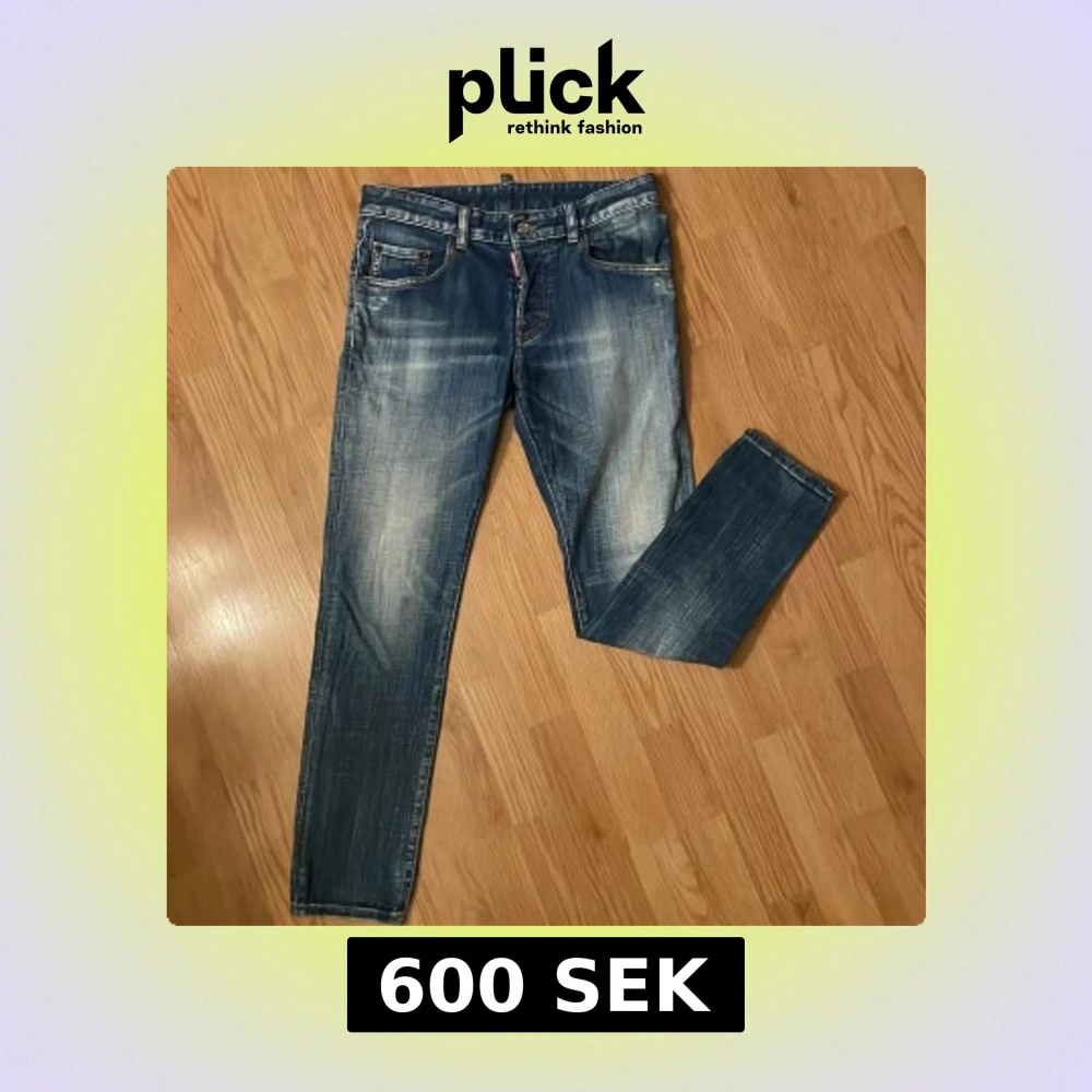 Snygga blå jeans från Dsquared2 med en klassisk femficksdesign och knappar i gylfen. Jeansen har en lätt slitning för en trendig look och en läderpatch med logotyp baktill. Perfekta för en stilren vardagsoutfit. Köpte på Zalando Lounge för 1600kr. Tyvärr har lappen på baksidan gått sönder vilket gör att ja drar ner priset. Använda få tal gånger (ca 5 gånger) storlek 14y junior