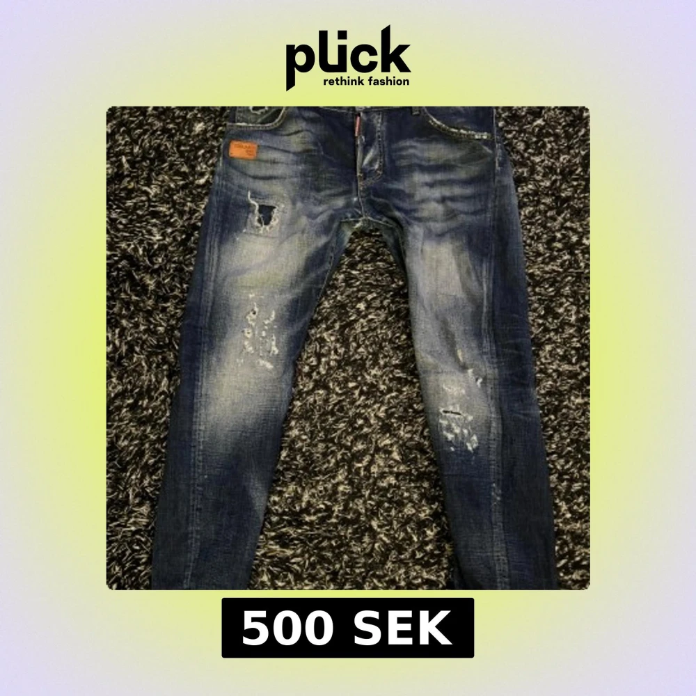 Snygga blå jeans från Dsquared2 som jag inte längre använder. Slitningarna är riktigt feta och den passar storlek 32. Riktigt sköna jeans. Priset är inte hugget i sten kan gå ner vid snabb affär.