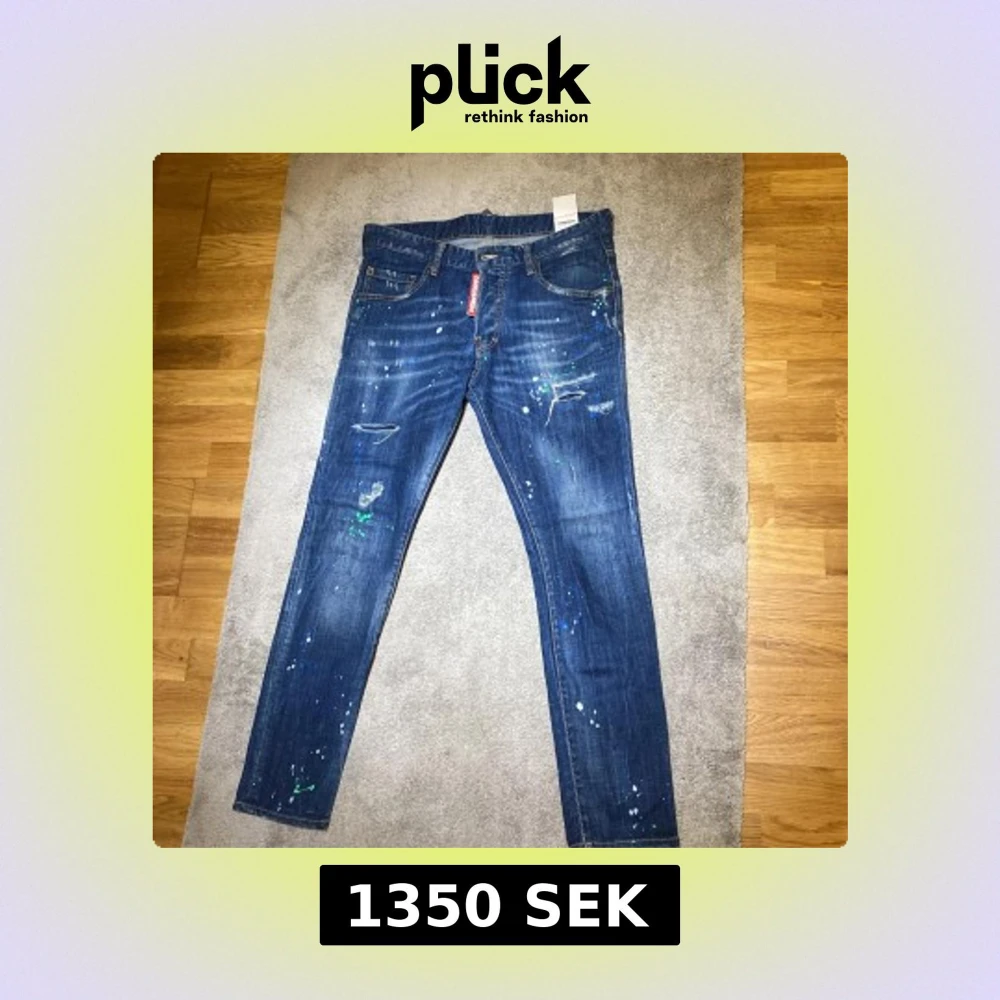 Snygga blå jeans från Dsquared2 med unika färgstänk i grönt och blått. De har en normal passform och klassisk femficksdesign. Äkta och finns kvitto med