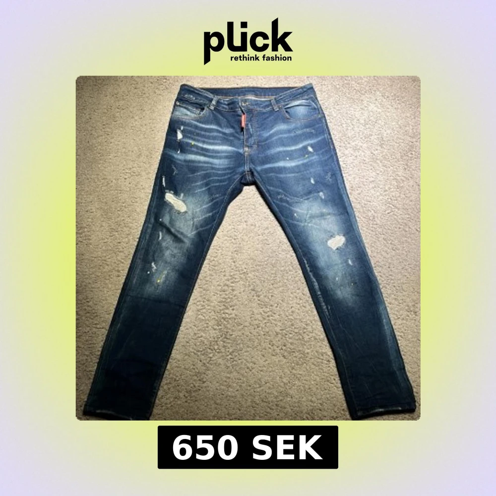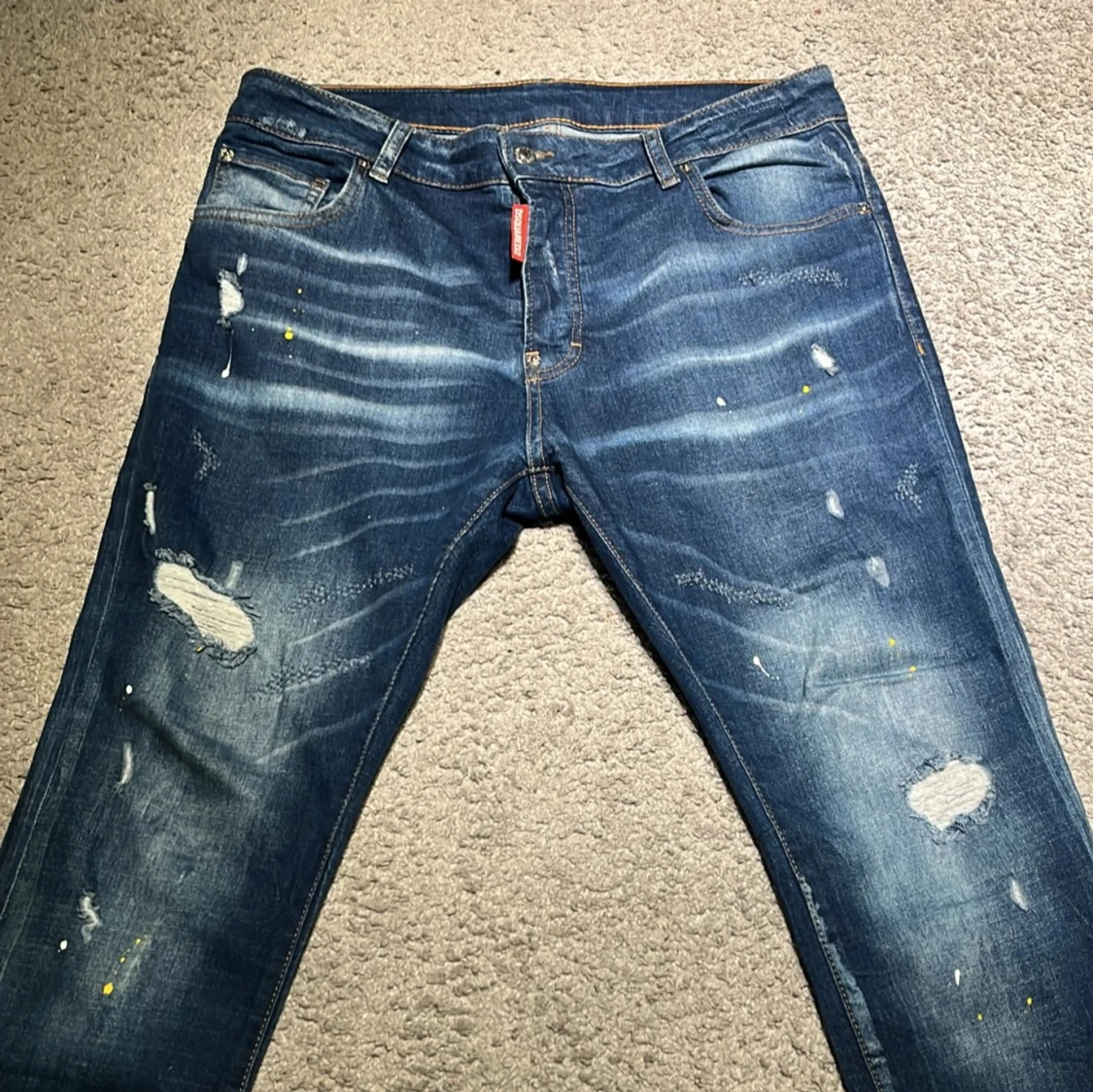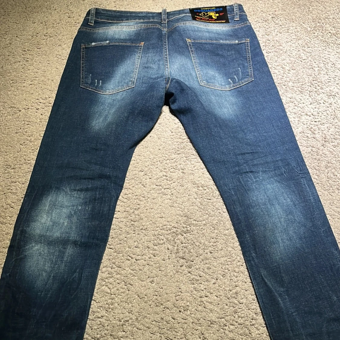 Snygga blå jeans från Dsquared2 med slitna detaljer och en snygg tvätt. De har en klassisk femficksdesign och en röd etikett vid gylfen. Perfekta för en avslappnad stil med en touch av edge. Storlek 48 vilket jag skulle säga passar bra mellan 31-33 i midjestorlek.