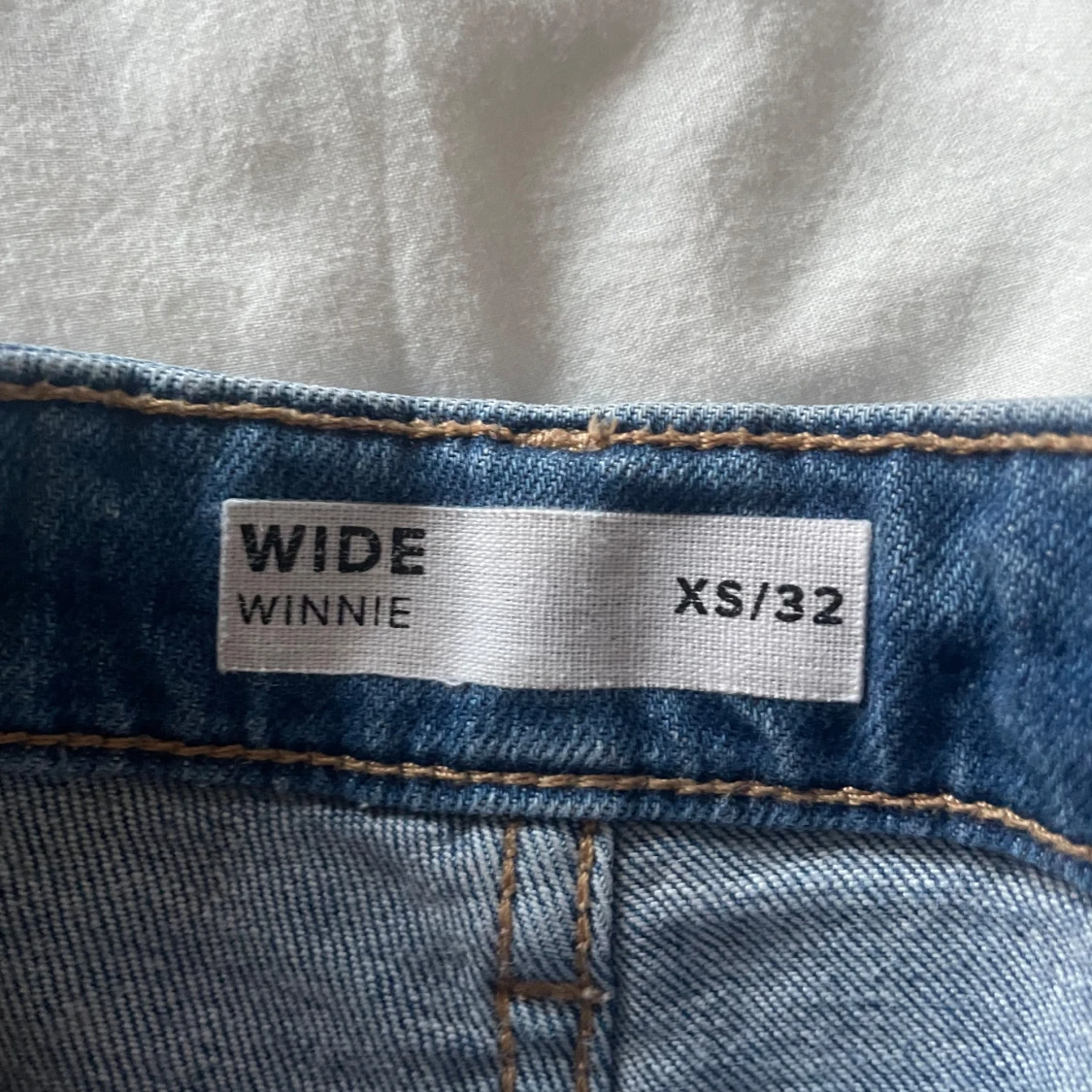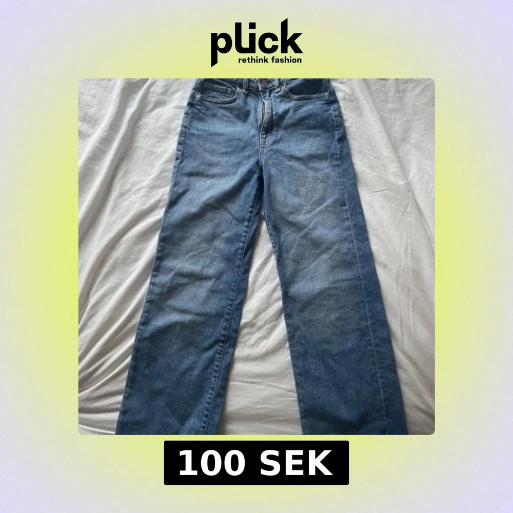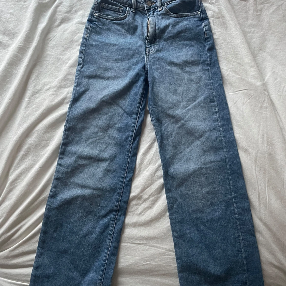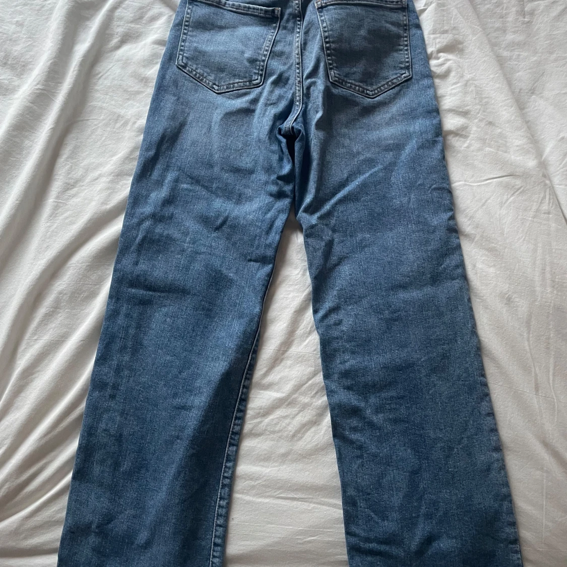 Blå jeans från Gina Tricot i storlek 32/XS. De har hög midja och straight passform. Knappt använda.