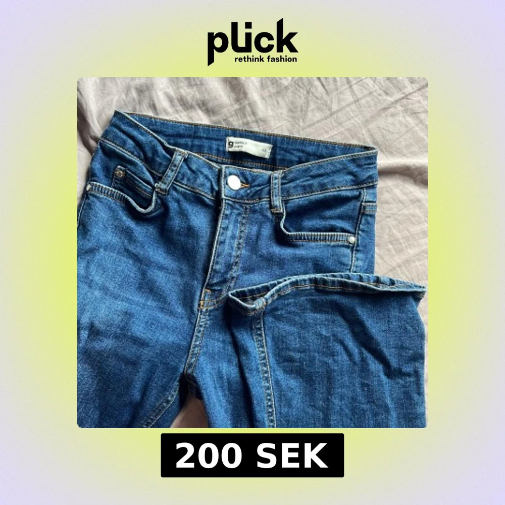 Snygga blå jeans från Gina Tricot med klassisk femficksdesign och knappgylf. Perfekta för en avslappnad stil. Märket 'perfect jeans' syns på baksidan. Midrise skulle jag säga och mått kan skrivas privat. Utsvängda