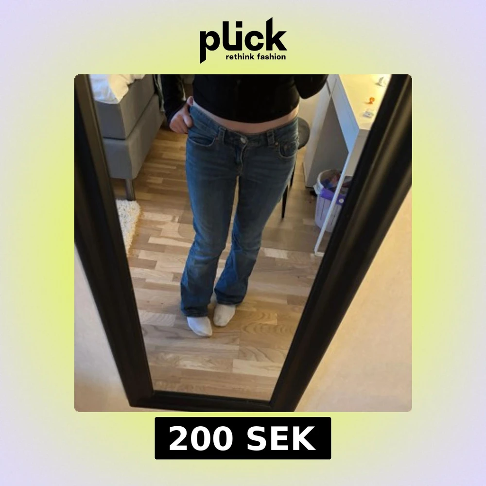 Snygga blå flare jeans från Gina Tricot, modellen Perfect Jeans. Klassisk femficksdesign med lock på bakfickorna och silverfärgade knappar. Jeansen har normal passform och är tillverkade i mjukt denimtyg med ljus tvätt.
