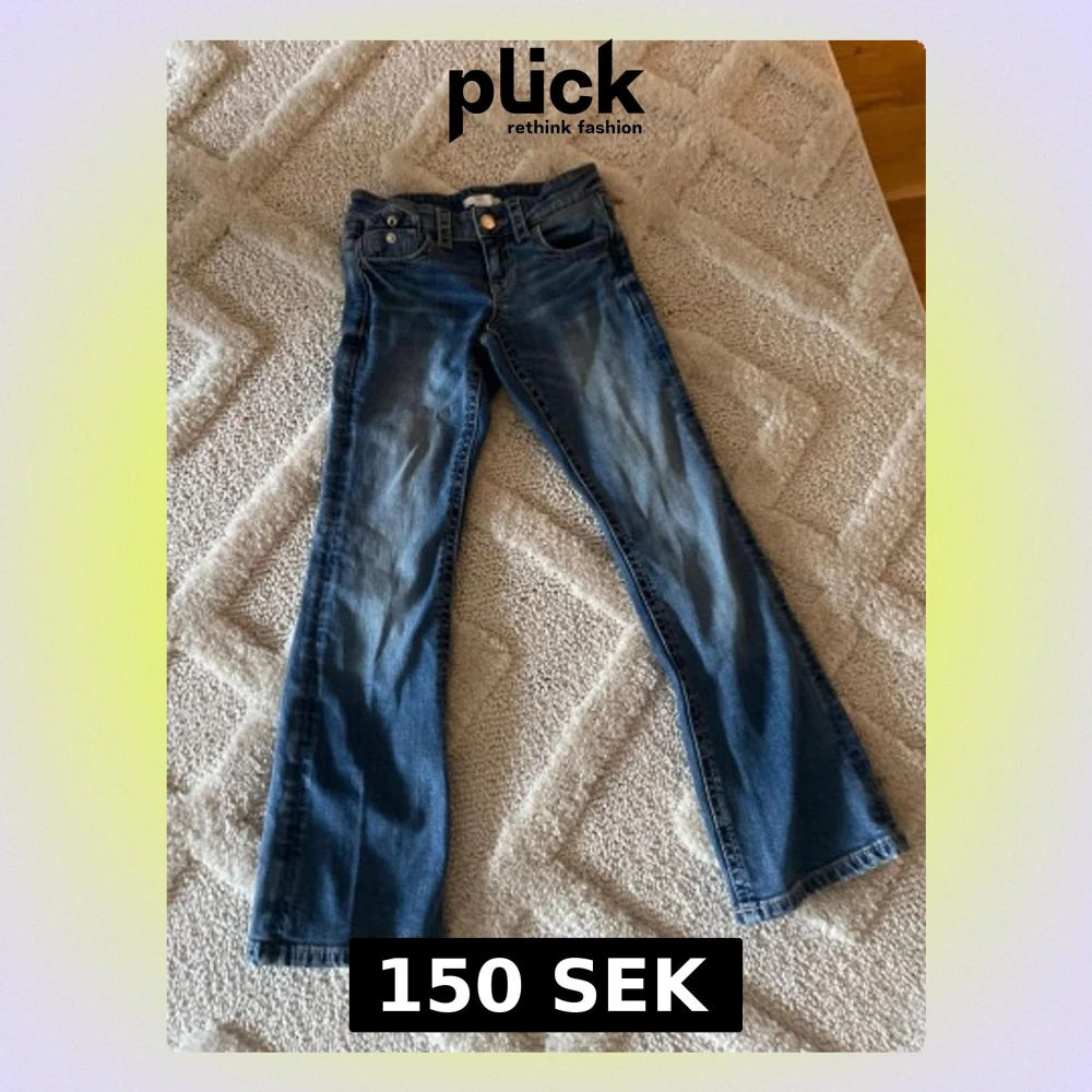 Snygga blå jeans från Gina Tricot i storlek 146. Klassisk femficksmodell med utsvängda ben och knappar på bakfickorna. Jeansen har en lätt tvättad look och är tillverkade i mjukt denimtyg som är skönt att bära hela dagen.