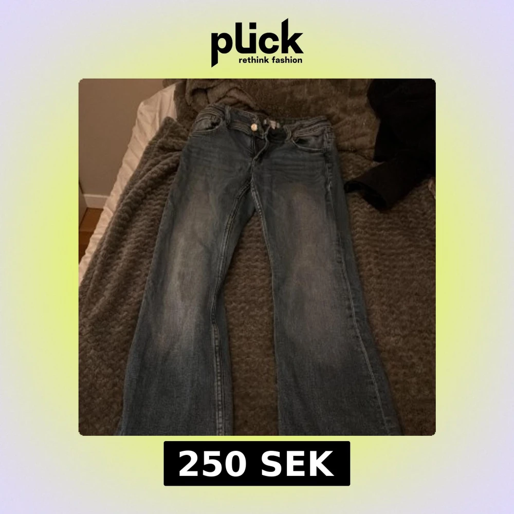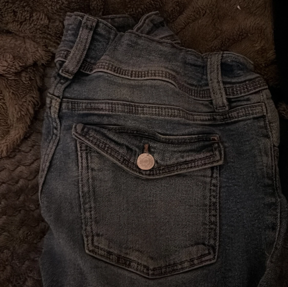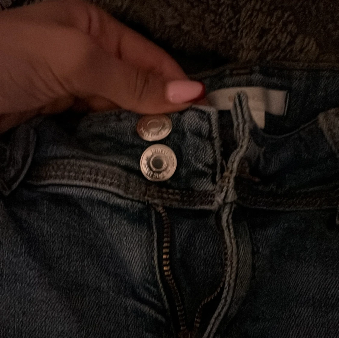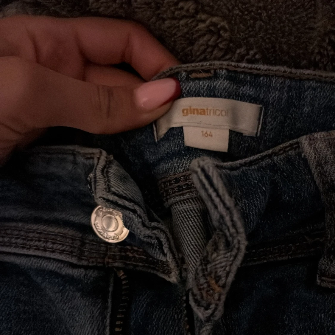 Snygga blå jeans från Gina Tricot i storlek 164. Klassisk femficksmodell med dragkedja och dubbla silverknappar fram. Jeansen har raka ben och en något lösare passform, perfekt för en avslappnad stil. Materialet är slitstarkt denim i bomull.