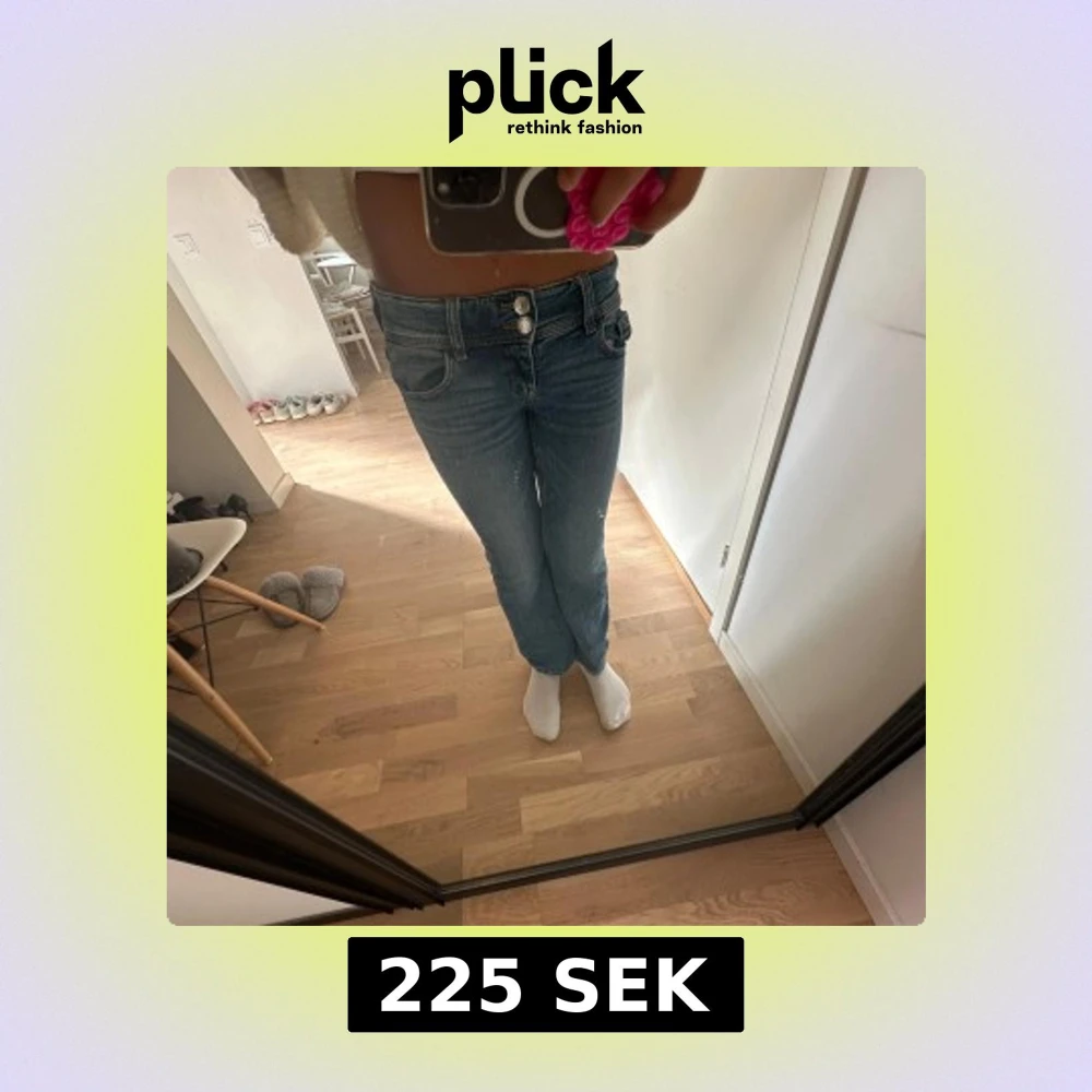 Snygga blå jeans från Gina Tricot i storlek 146. Modellen har normal passform med raka ben/bootcut och klassisk femficksdesign. Jeansen har dubbla knappar i midjan och är tillverkade i mjukt denimtyg. Perfekta för dig som gillar enkel och stilren look.Tyvärr har jeansen blivit för små så de är därför jag säljer dem!!