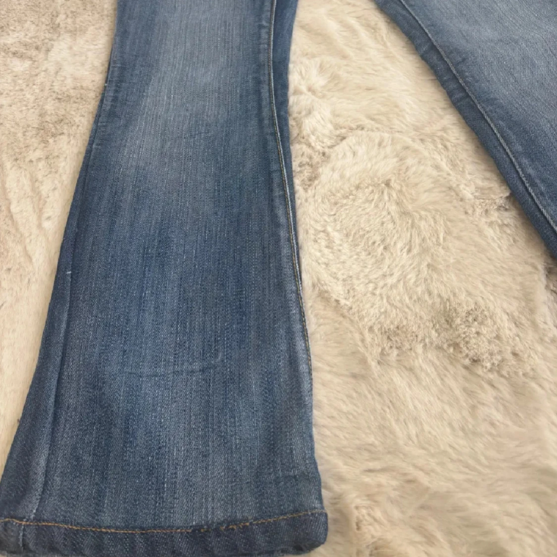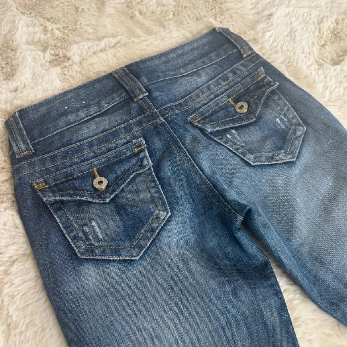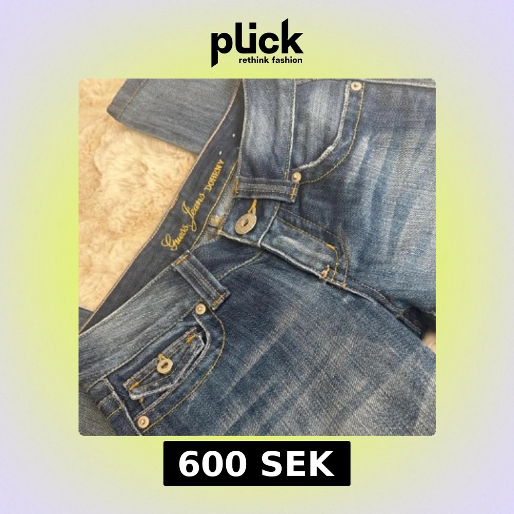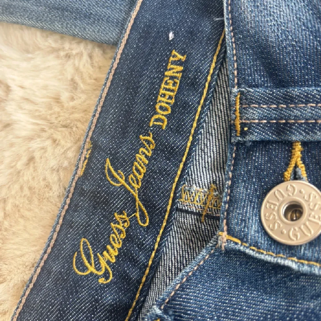 Snygga blå jeans från Guess med klassisk femficksdesign och knappdetaljer.jag har köpt dom här på plick men dom var tyvärr försmå så jag behöver sälja dom igen. Dom har små slitningar längst ner vid föten men det syns inte alls när dom är på. Skickar gärna fler bilder och diskuterar priset🥰