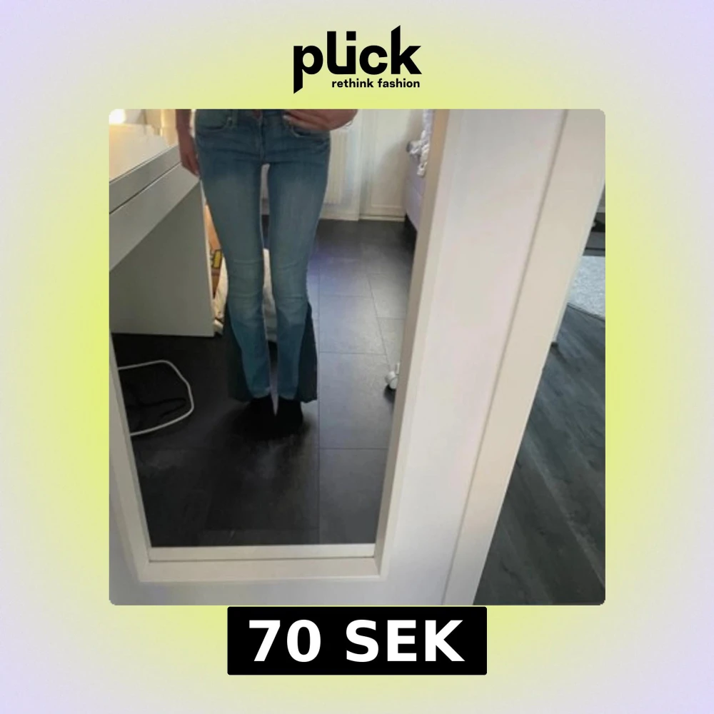 Snygga low waist blå jeans från H&M med en klassisk bootcut-stil. De har en normal passform och är tillverkade i denim. Perfekta för en avslappnad look.Jag säljer jeansen eftersom dom är förkorta för mig och ser därför lite konstiga ut på bild! Skriv för mer info.