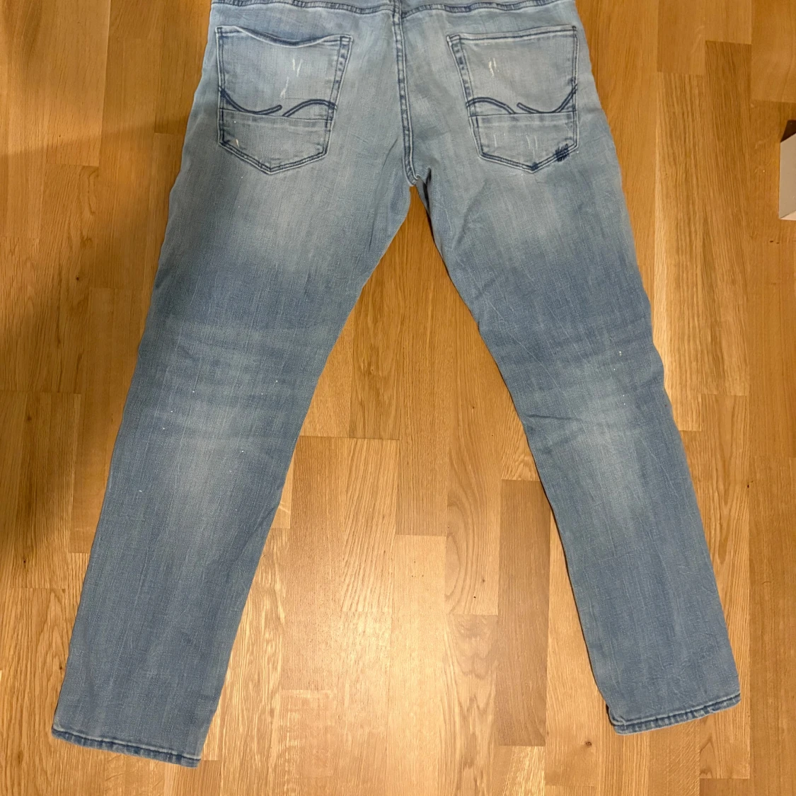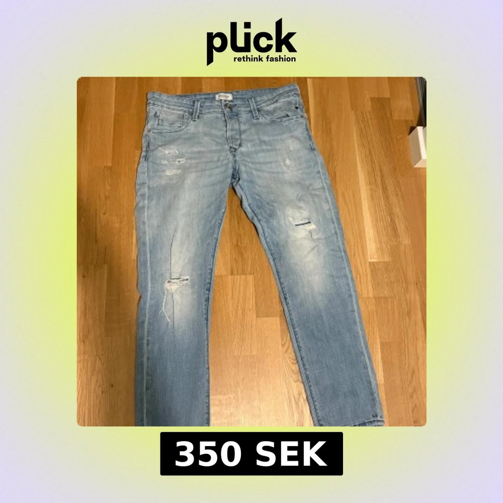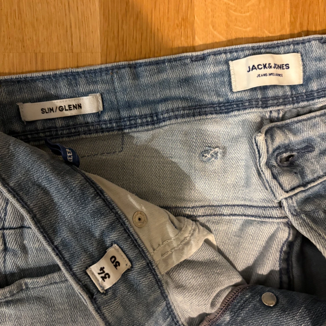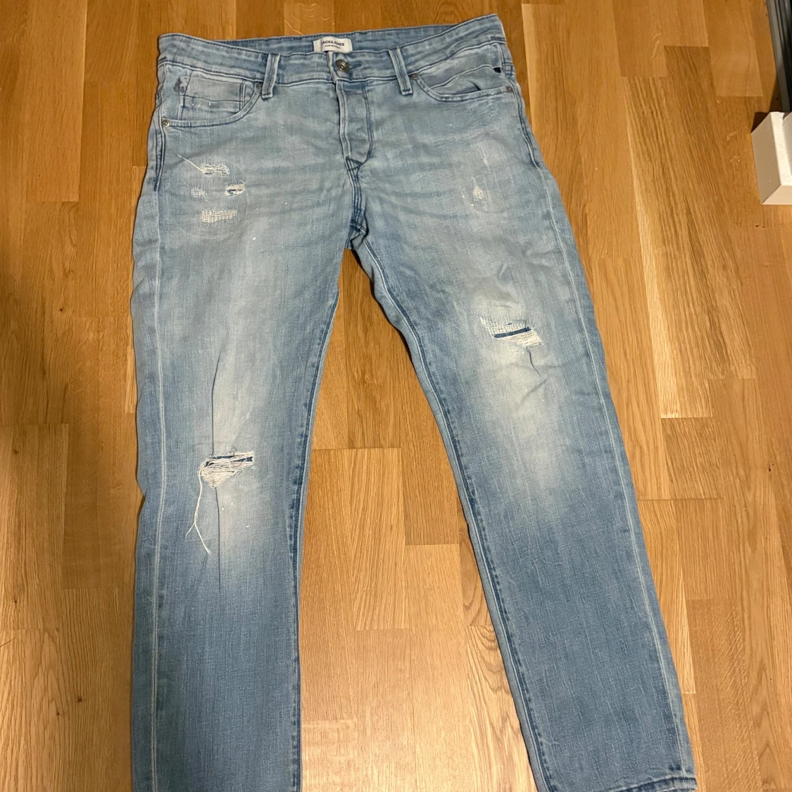 Snygga blå jeans från Jack & Jones i modellen Slim/Glenn. De har en modern slim passform med slitna detaljer och en klassisk femficksdesign. Perfekta för en avslappnad stil.