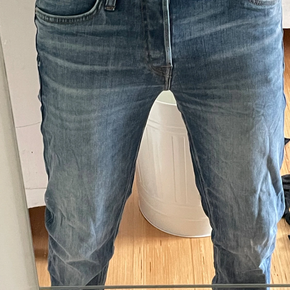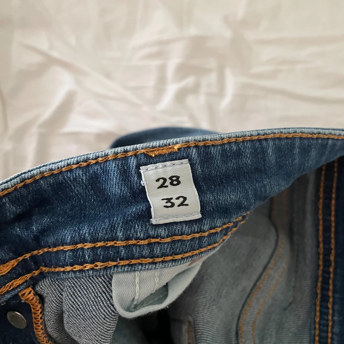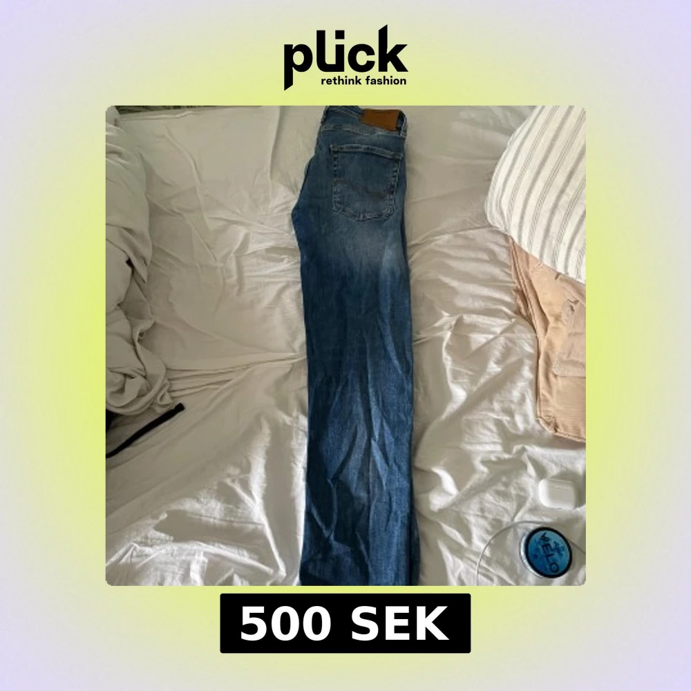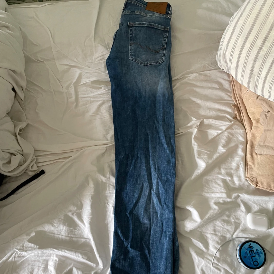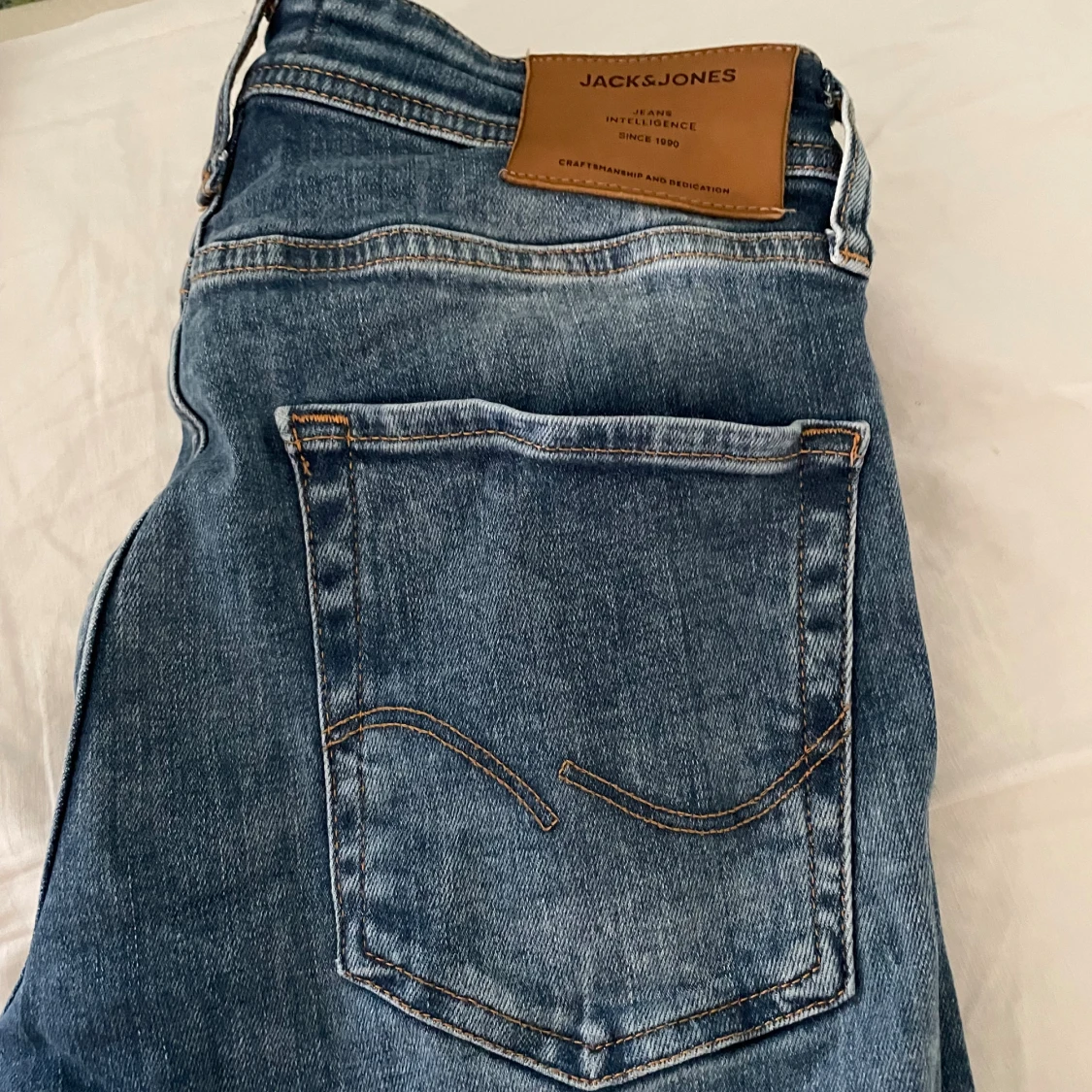 Säljer ett par klassiska blå jeans från Jack & Jones i storlek 28/32. Jeansen har en snygg tvätt med lätt slitning, fem fickor och bruna detaljer på bakfickan. Modellen har normal passform och raka ben. Perfekta till sneakers och hoodie.