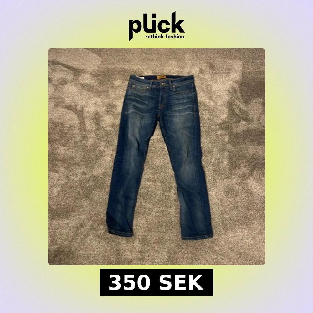 Säljer ett par snygga blå jeans från Jack & Jones, modell Comfort/Mike. De har snygga slitningar på fram och baksidan. Helt ny skick, använda max 10 gånger. Köpta för 900 kronor.