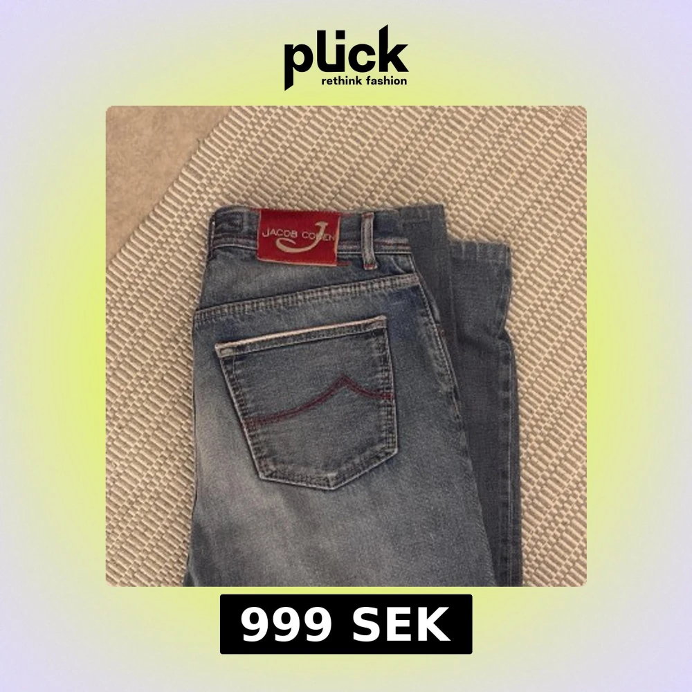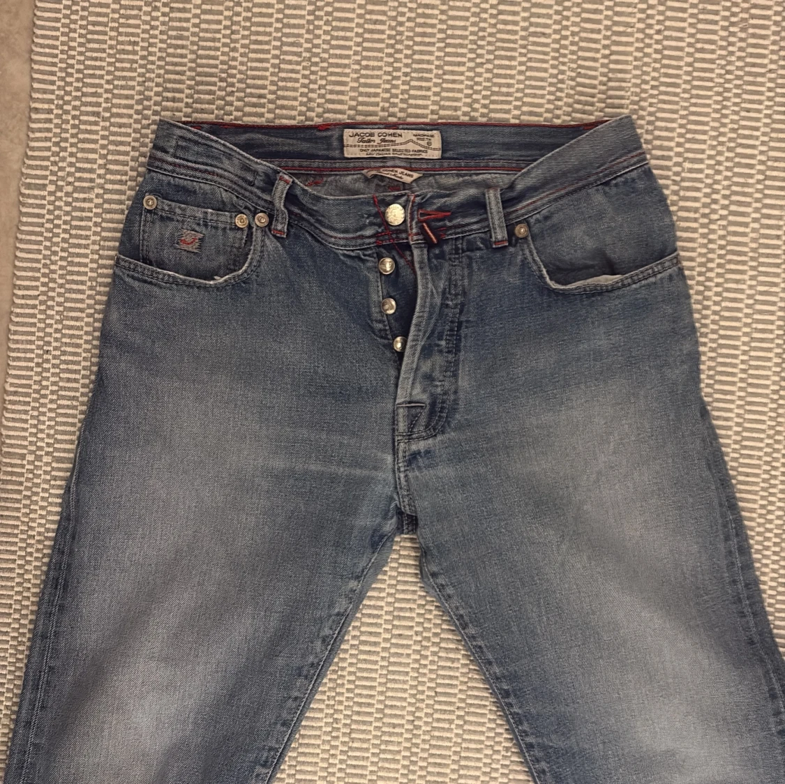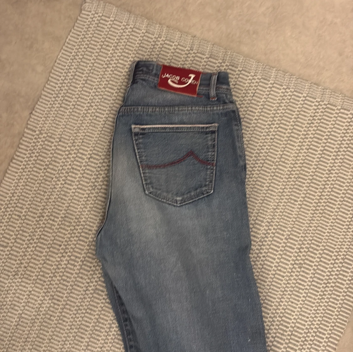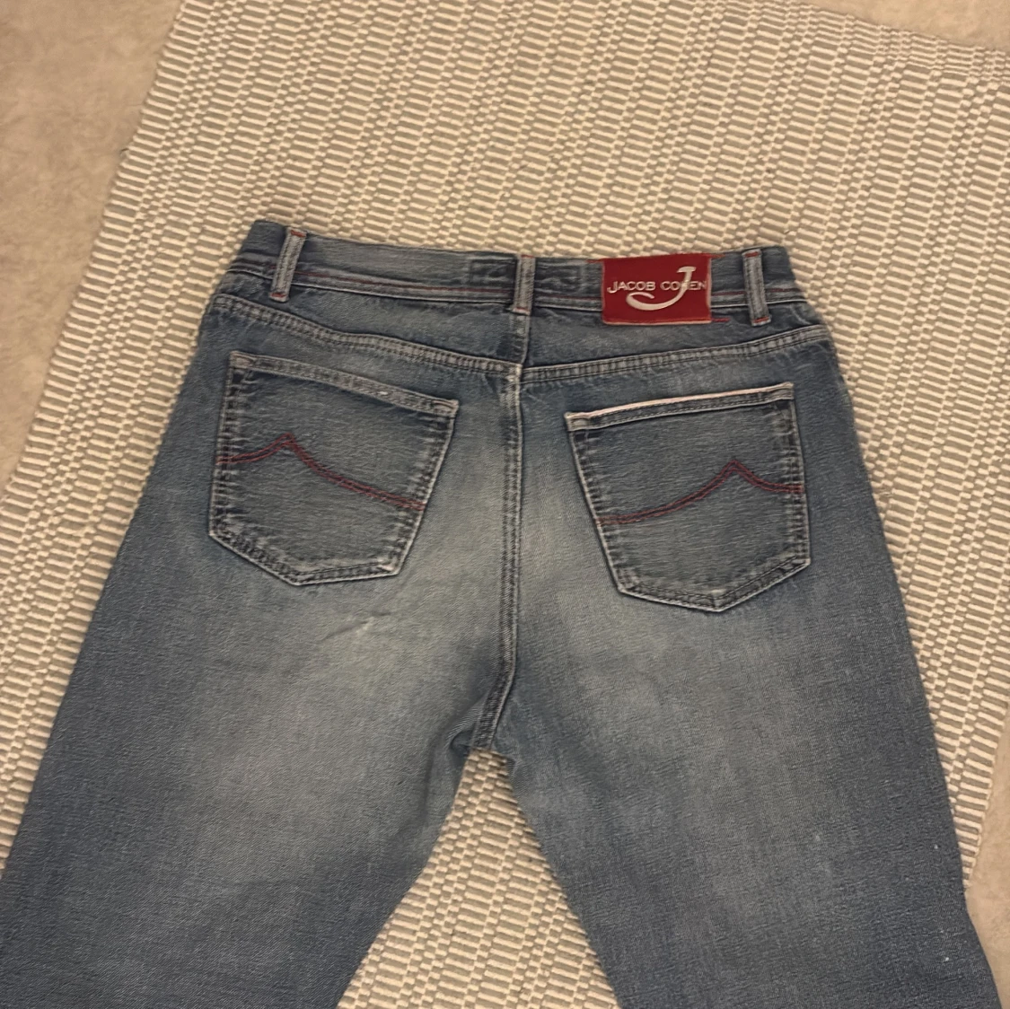 Snygga blå jeans från Jacob Cohen med coola röda sömmar och en röd patch bak i midjan. Jeansen har klassisk femficksdesign, knäppning med knappar och diskret slitning för en avslappnad look. Perfekta för dig som gillar stilrena men ändå unika jeans. Strl 33.