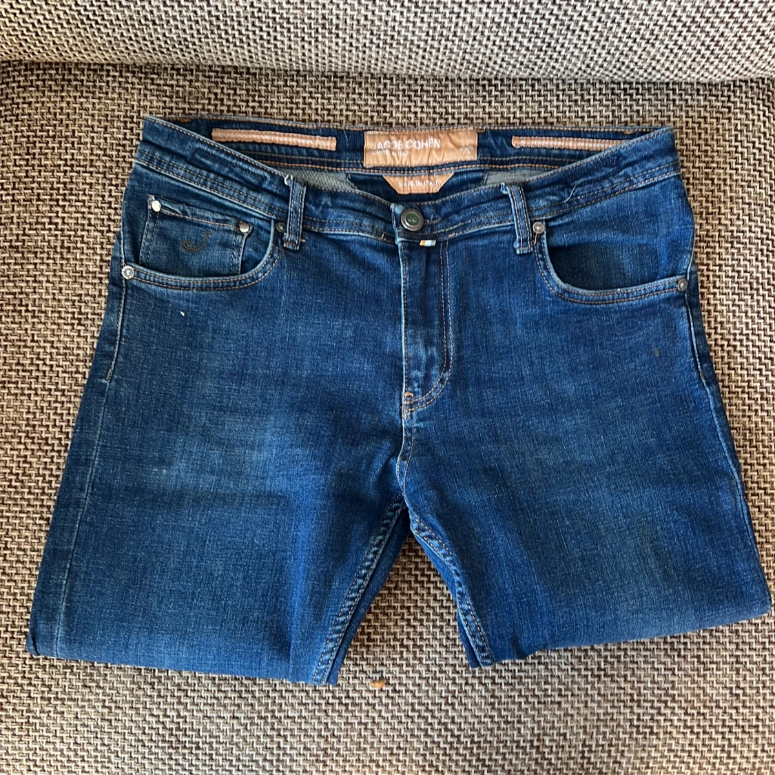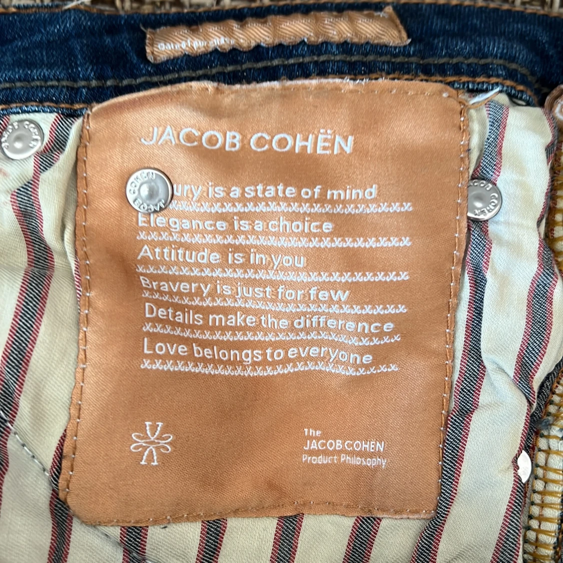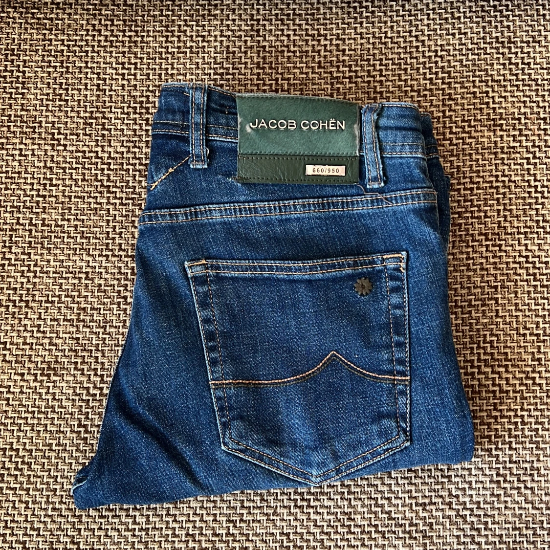 Säljer ett par klassiska blå jeans från Jacob Cohën med snygga kontrastsömmar och femficksdesign. Jeansen har normal passform och är tillverkade i ett mjukt denimtyg. Märkespatch baktill och detaljerad insida med citat.