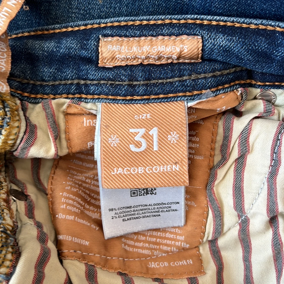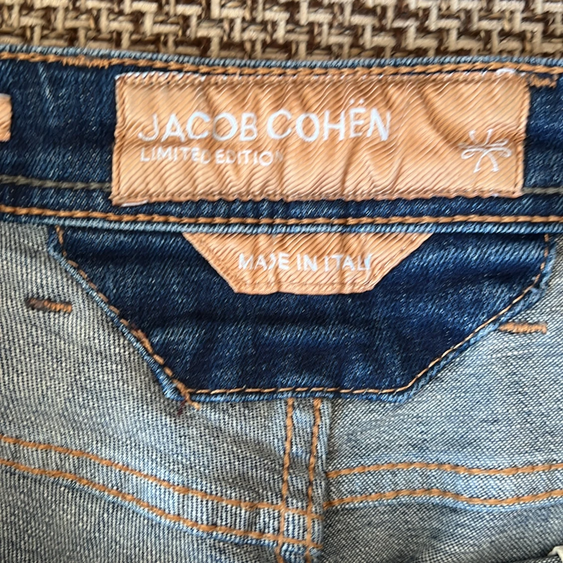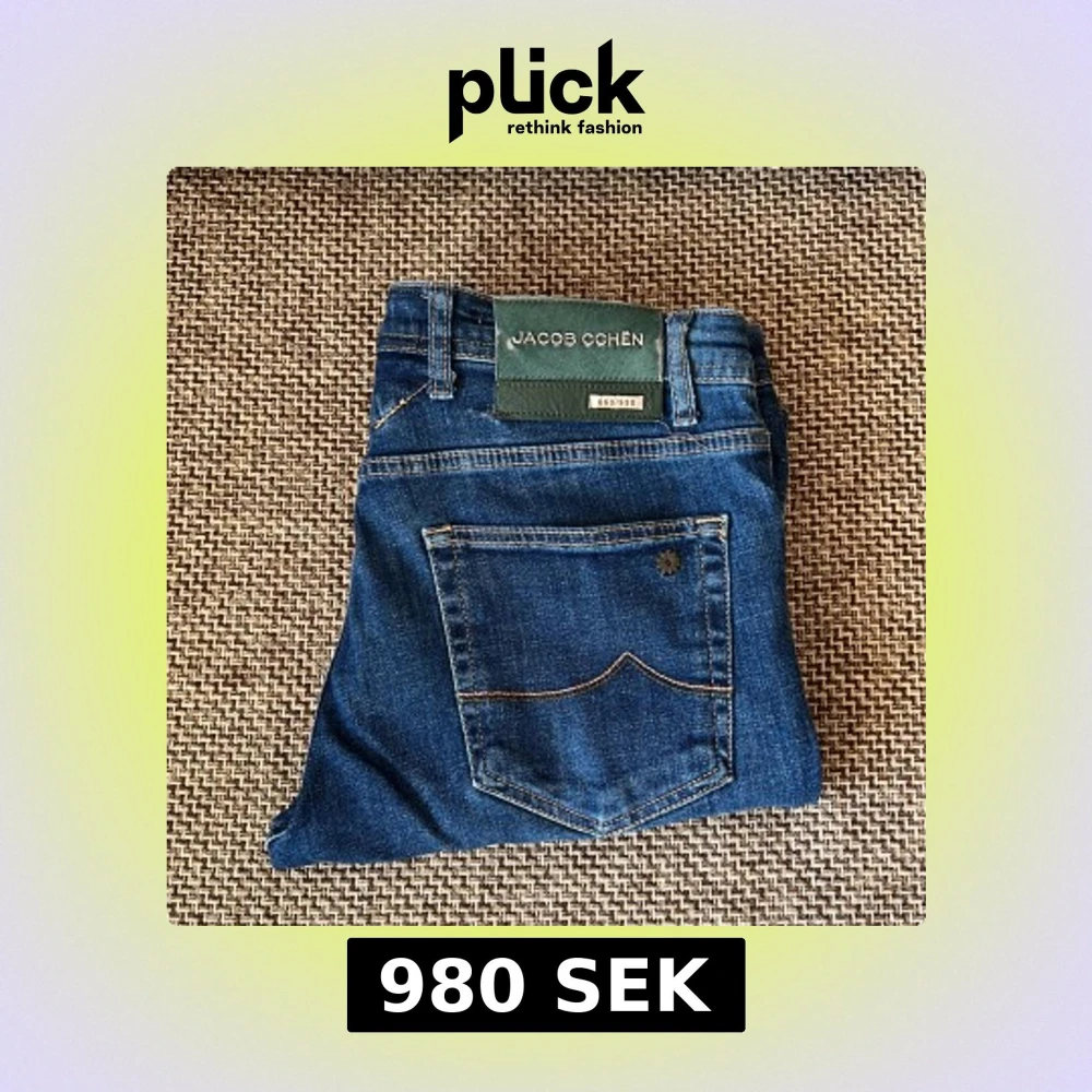 Säljer ett par klassiska blå jeans från Jacob Cohën med snygga kontrastsömmar och femficksdesign. Jeansen har normal passform och är tillverkade i ett mjukt denimtyg. Märkespatch baktill och detaljerad insida med citat.