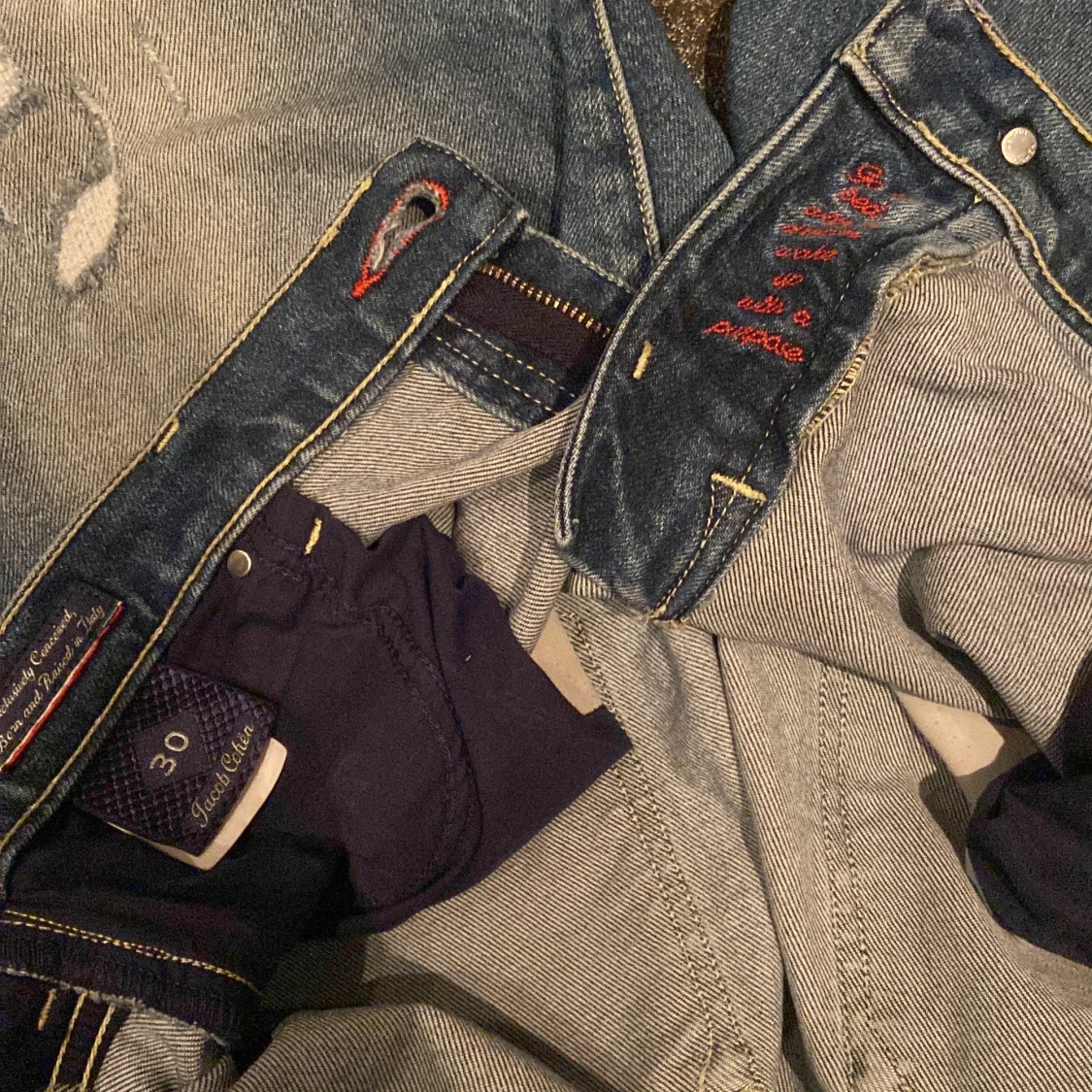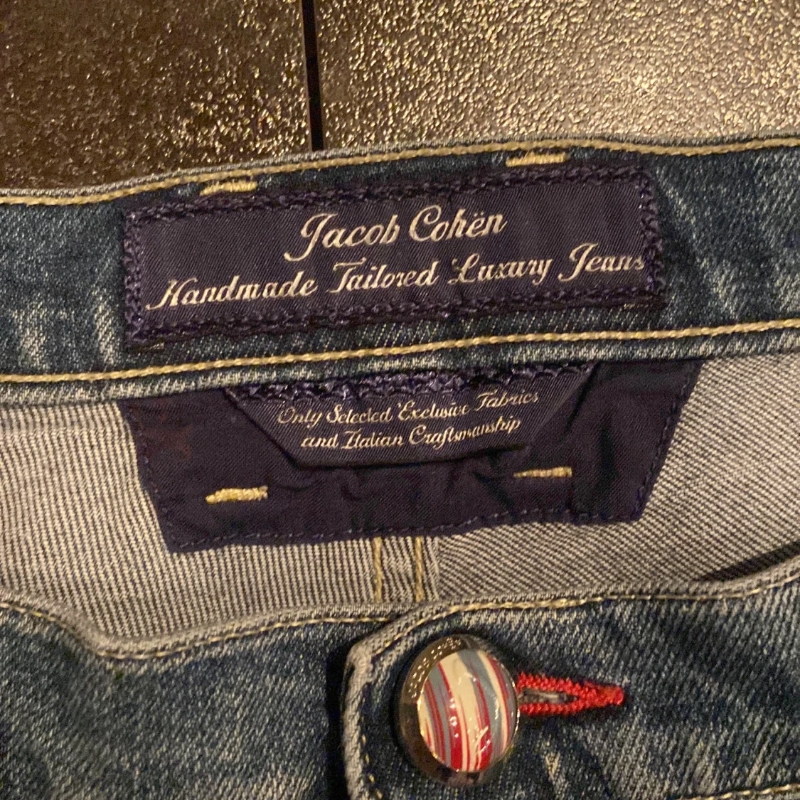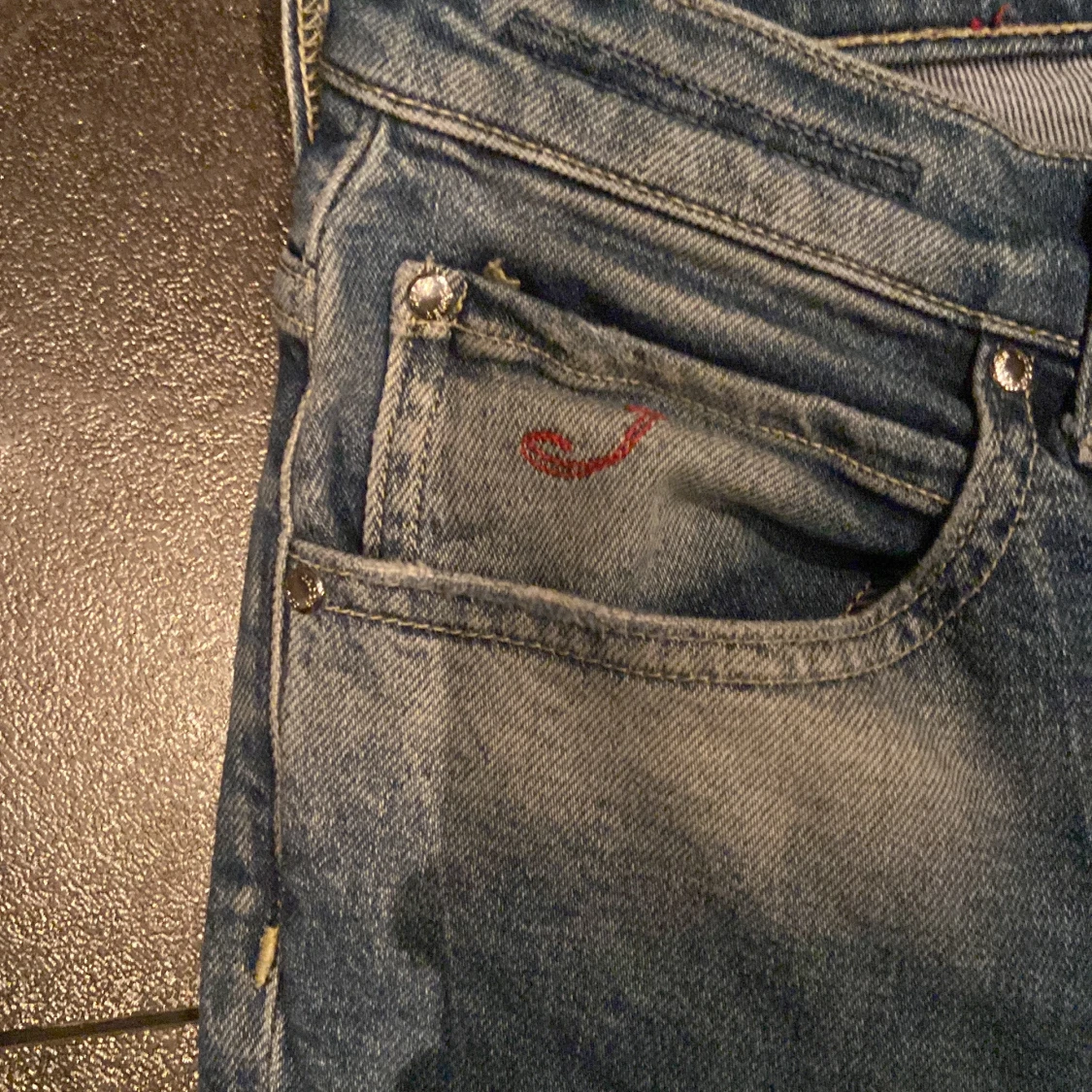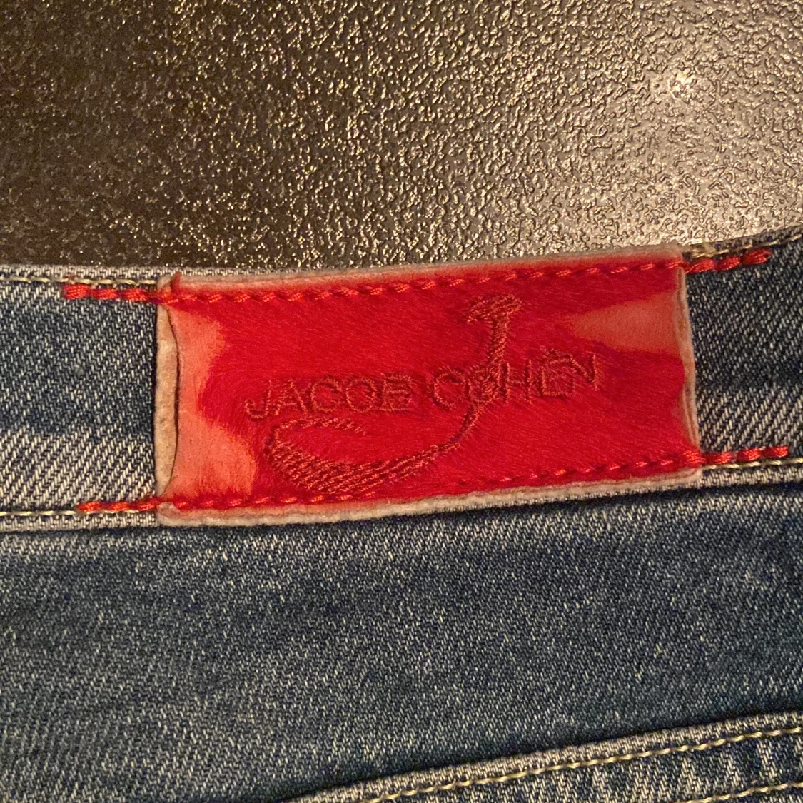 ÄKTA Snygga blå jeans från Jacob Cohen med slitna detaljer och broderad logga. De har en klassisk femficksdesign och knappar i midjan. Perfekta för en avslappnad stil med en touch av lyx. Italiensk storlek 30