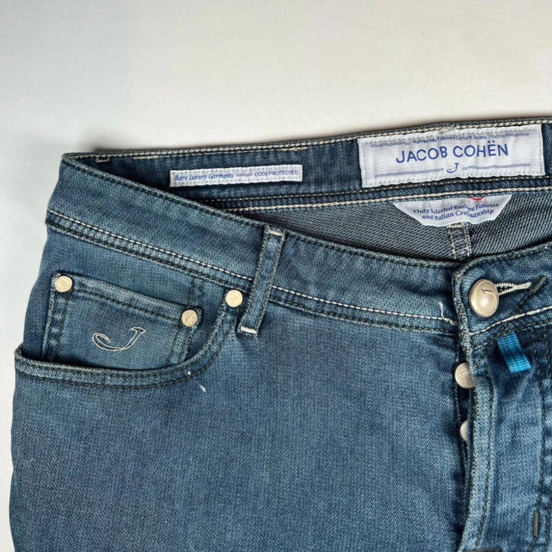 Snygga blå jeans från Jacob Cohen med klassisk femficksdesign och knappgylf. Jeansen har en stilren look med subtila detaljer och en broderad logga på myntfickan som är i perfekt skick! Alla Jacob Cohën jeans är 34" längd. W34.