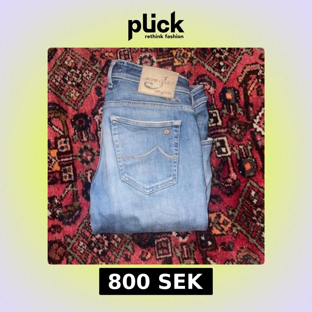 Snygga blå jeans från Jacob Cohen med klassisk femficksdesign och ljus tvätt. Byxorna har raka ben och diskreta broderade detaljer på fickan. Perfekta för en avslappnad och stilren look. de defekter som finns på varan syns på första och sista bilden 1(loggan) 5(2 hål i skrevet)