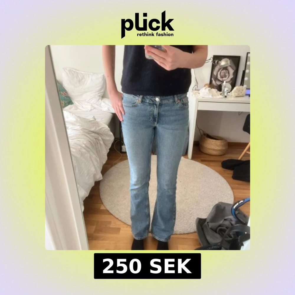 Snygga blå jeans från Junkyard med bootcut-stil. Lowwaisted o skitsnygga men används tyvärr inte längre. Bakre fickan har en defekt (se sista bild) men det går säkert att sy ihop