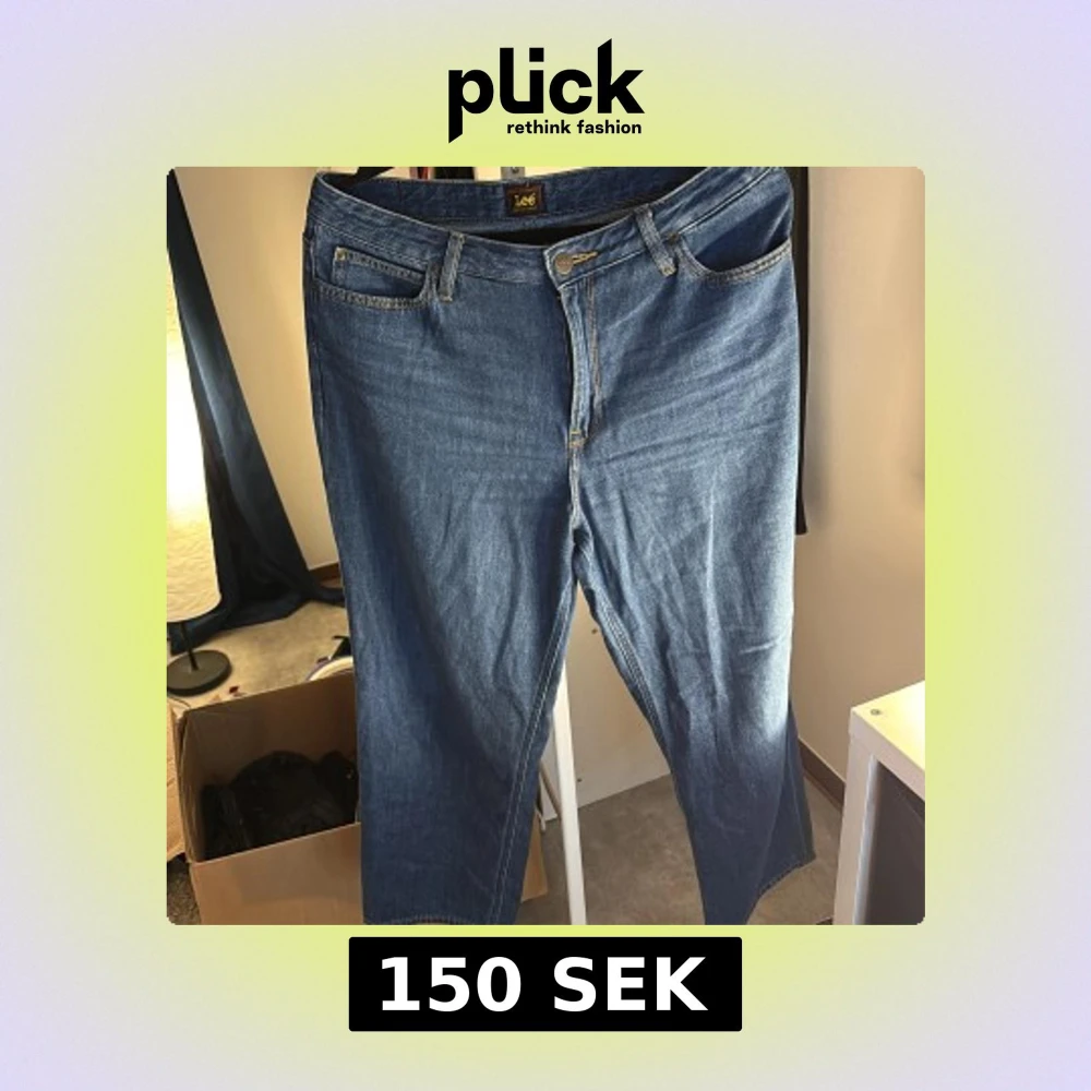 Säljer ett par snygga blå jeans från Lee i ekologisk bomull. De har en wide leg passform och låg midja, perfekt för en avslappnad stil. Klassisk design med fem fickor och knappgylf.