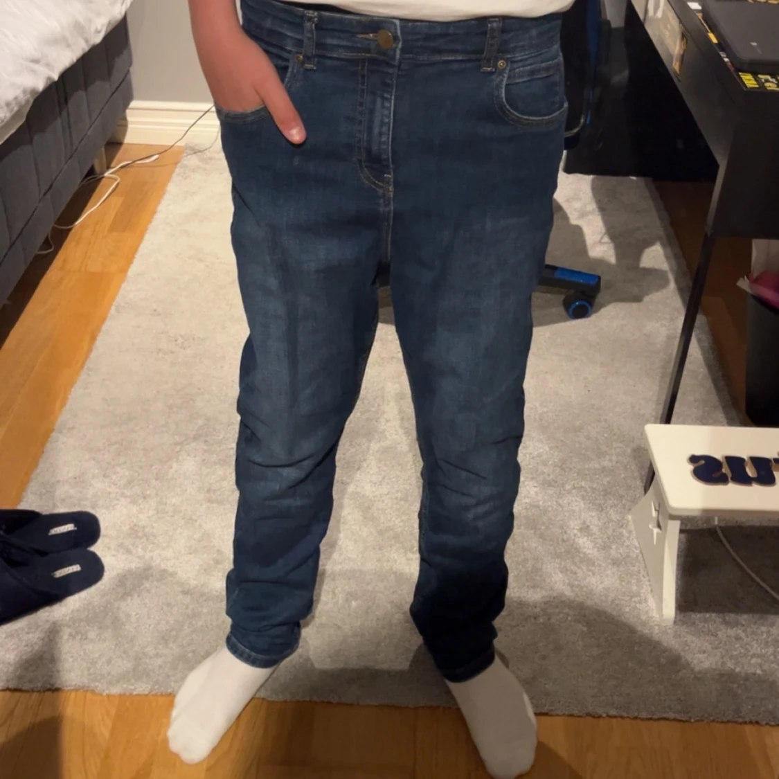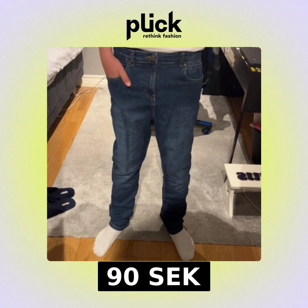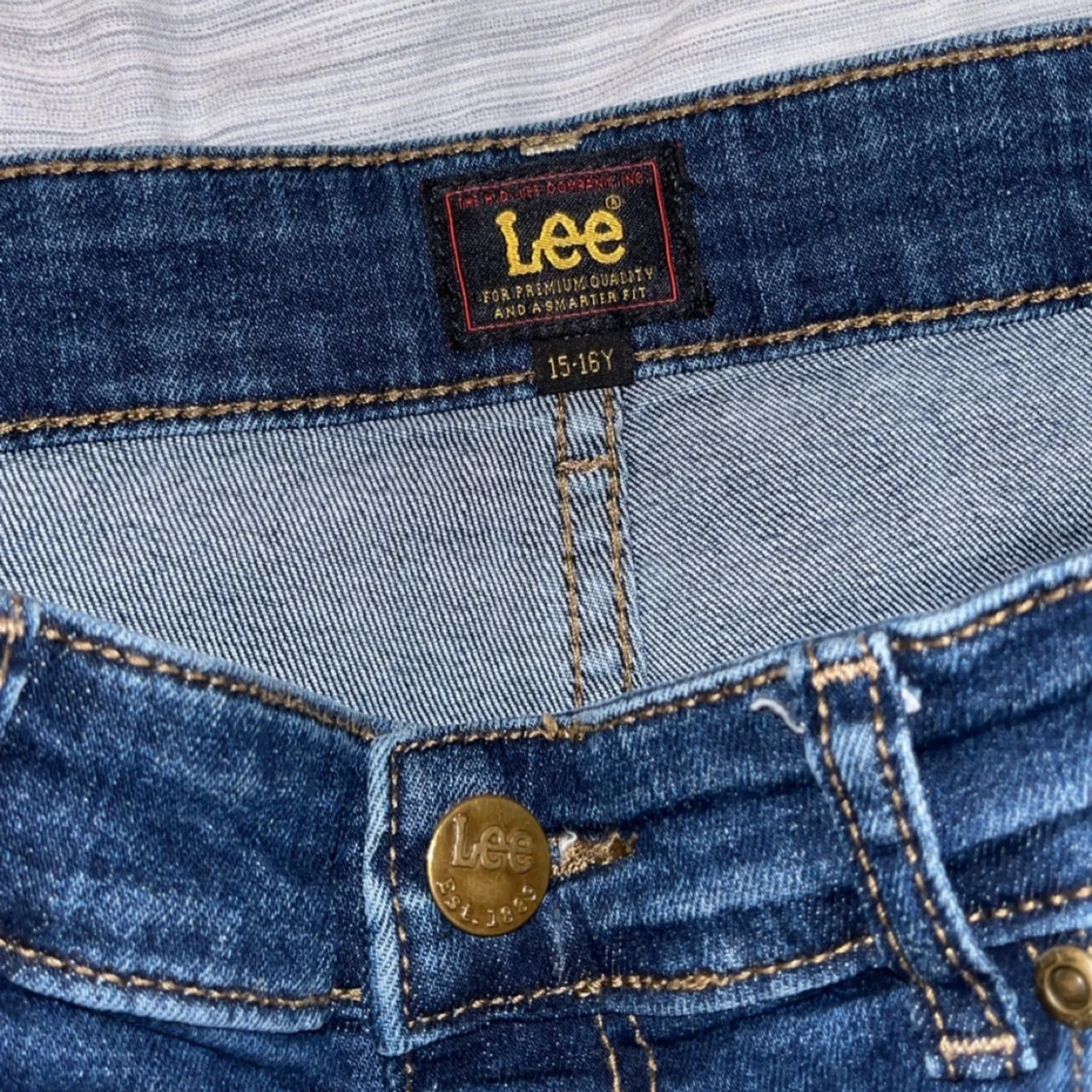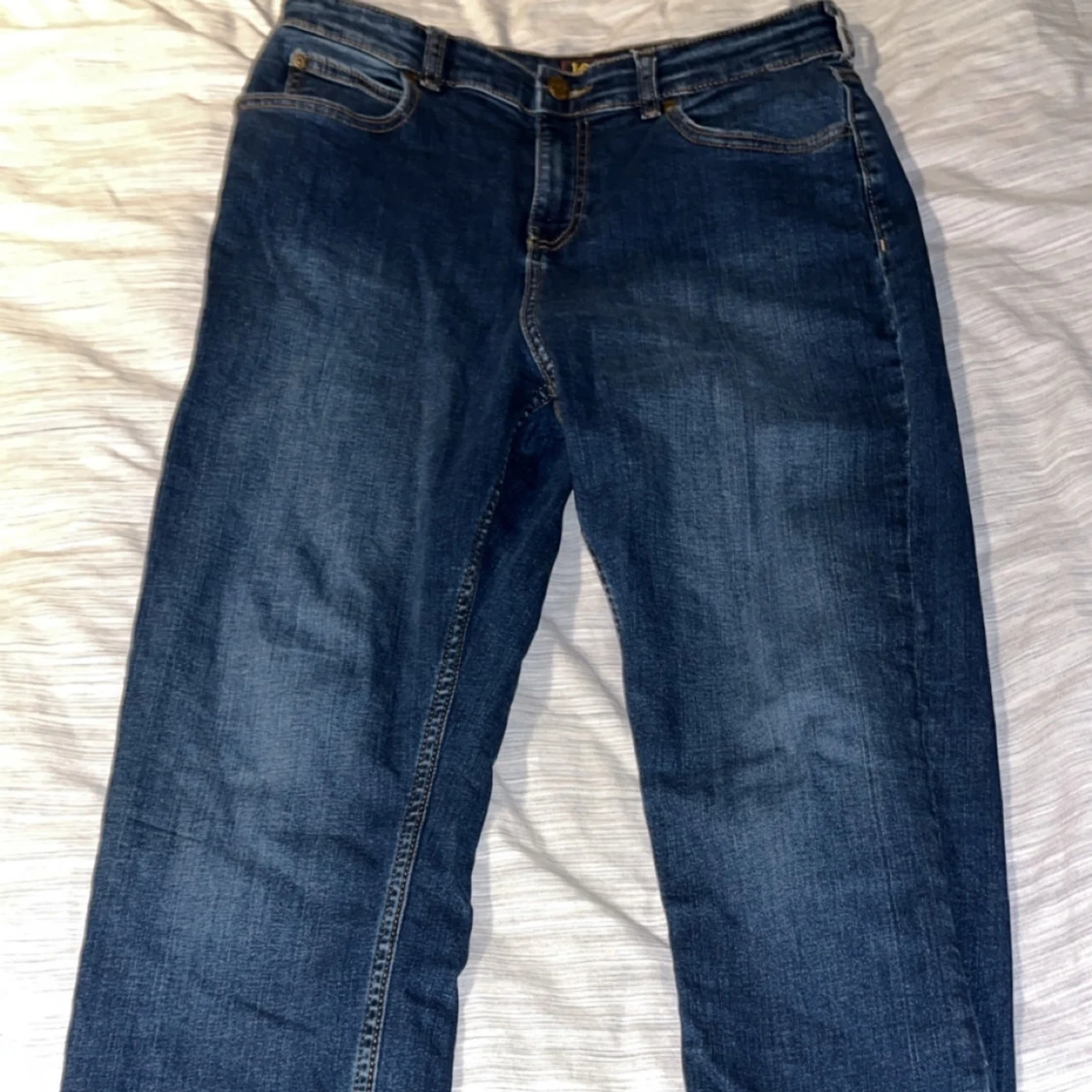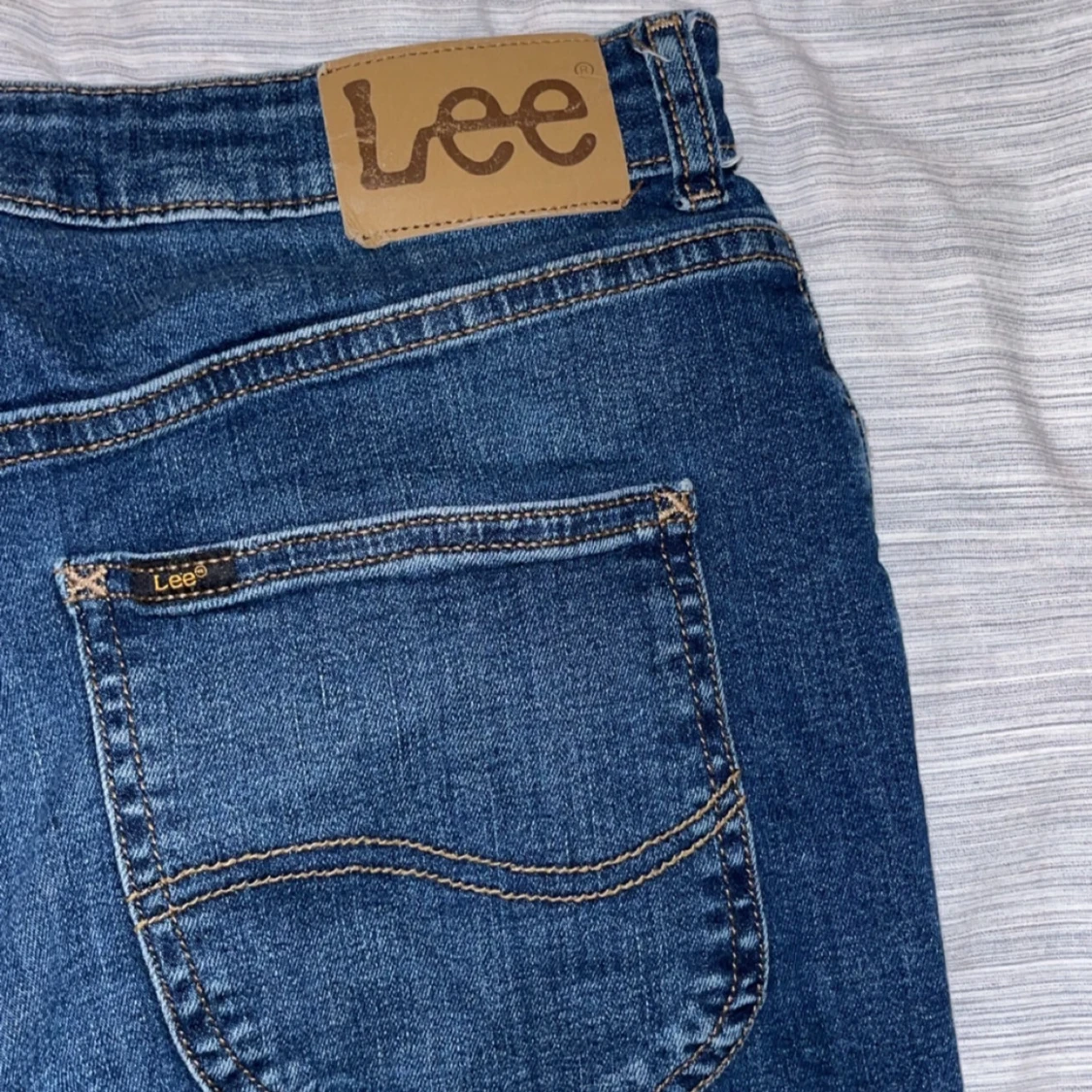 Säljer ett par klassiska blå jeans från Lee i mid wash. Jeansen har normal passform och raka ben. Materialet är 99% bomull och 1% elastan för lite stretch. Perfekta till vardags och lätta att matcha med det mesta. Köpta på kidsbrandtore. Några funderingar så är det bara att kontakta.