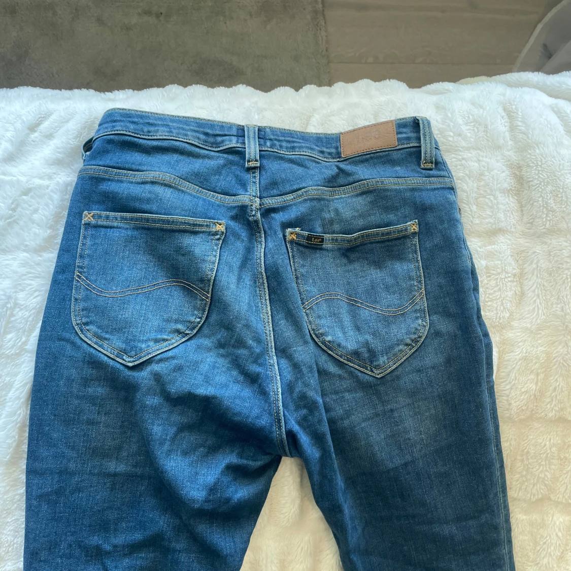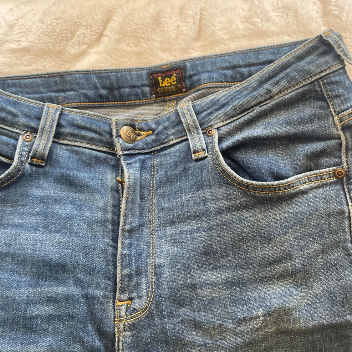 Snygga blå jeans från Lee som är väl använda. Dem har blivit lite uppslitna längst ner på benet på grund av att man har trampat på dem. Annars är dem i bra skick
