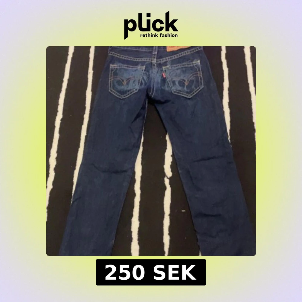 Säljer ett par klassiska blå jeans från Levi's med snygga kontrastsömmar och femficksdesign. De har en normal passform och är perfekta för en avslappnad stil. Levi's logotyp syns tydligt på bakfickan. Waist 26.