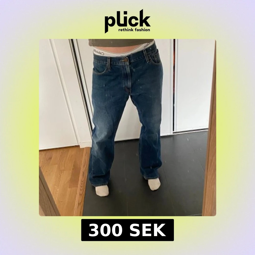 Säljer ett par klassiska blå Levi's jeans med rak passform. De har en traditionell femficksdesign och en knappgylf. Perfekta för en avslappnad stil. Köpta i USA.