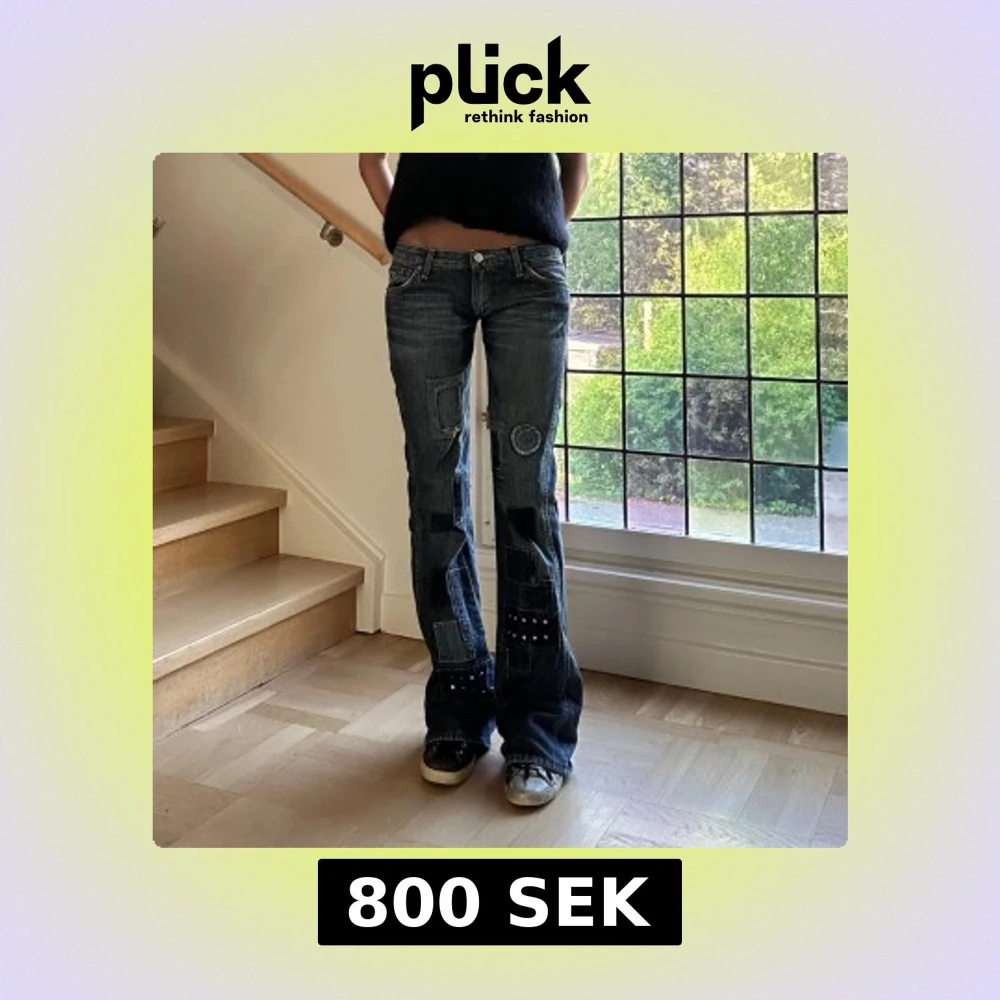 Såå coola och unika vintage jeans från Louís med super nice patchdown med nitar och detaljer. Lågmidja och bootcut! Nitar längst ner på benen för en edgy vibe. Tillverkade i klassiskt denimtyg och har coola fickor både fram och bak.