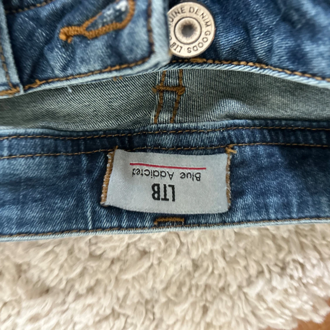 Säljer ett par klassiska blå jeans från LTB Blue Addiction. Jeansen har raka ben, snygga slitningar och kontrastsömmar. De har fem fickor och läderpatch bak. Har tyvärr lite vita färg fläckar❤️ i storlek s-m