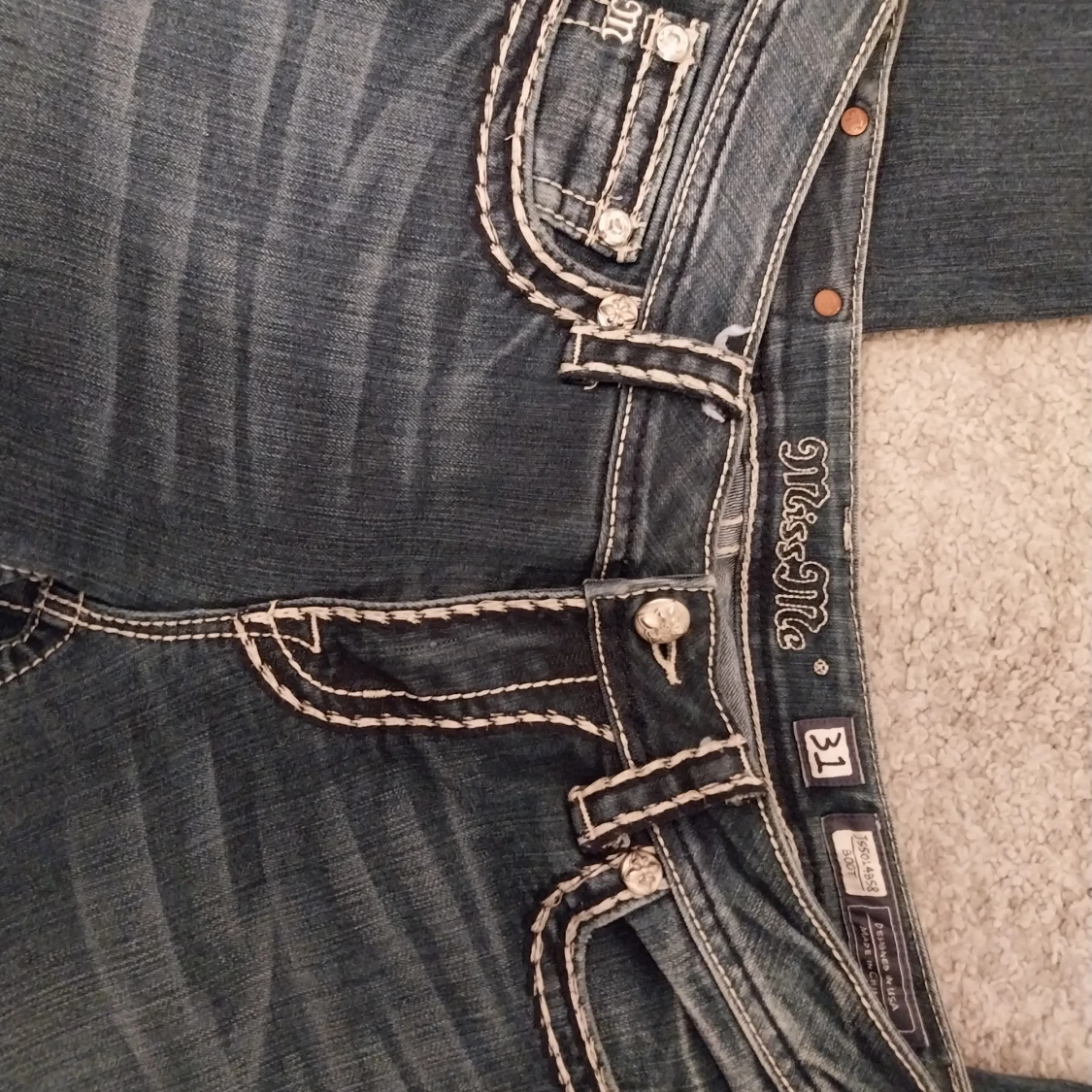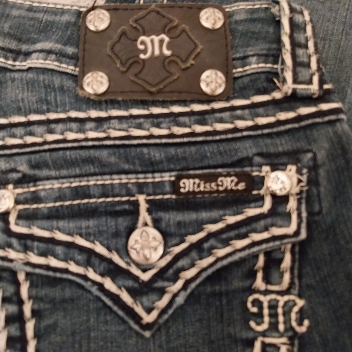 Snygga blå jeans från Miss Me med dekorativa sömmar och detaljerade bakfickor. Byxorna har en bootcut-stil och är prydda med knappar och broderier. Perfekta för dig som gillar en unik och stilren look.