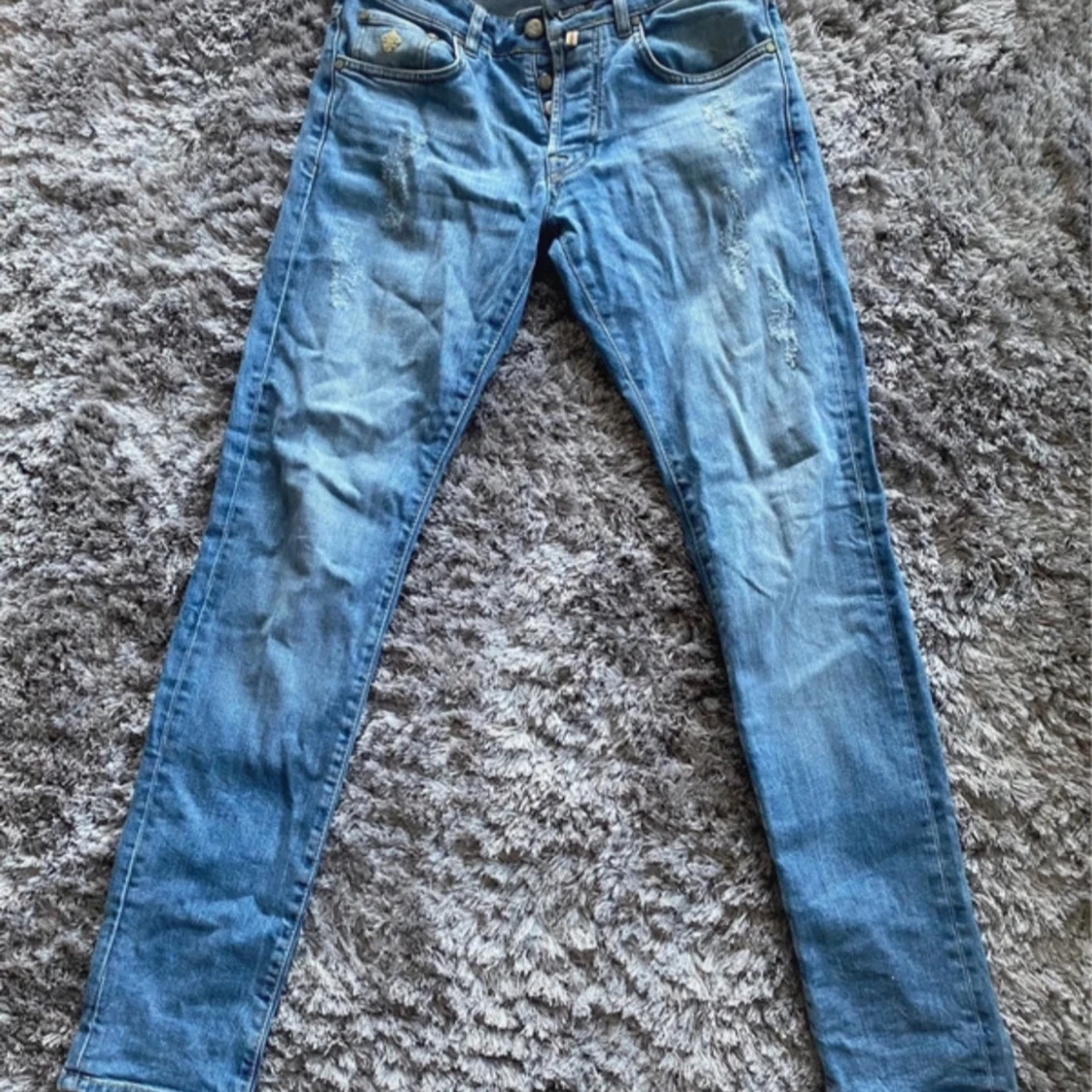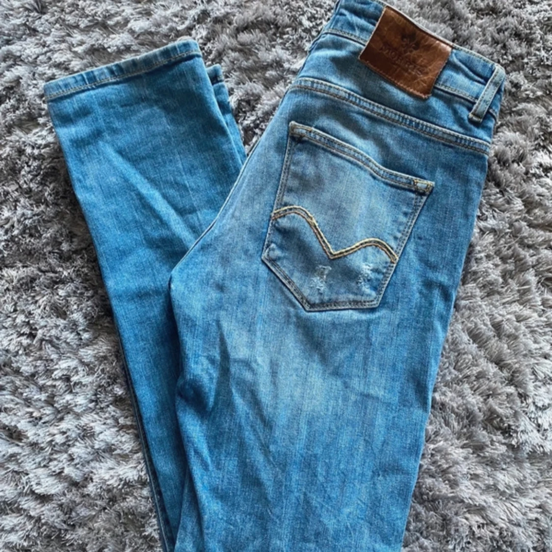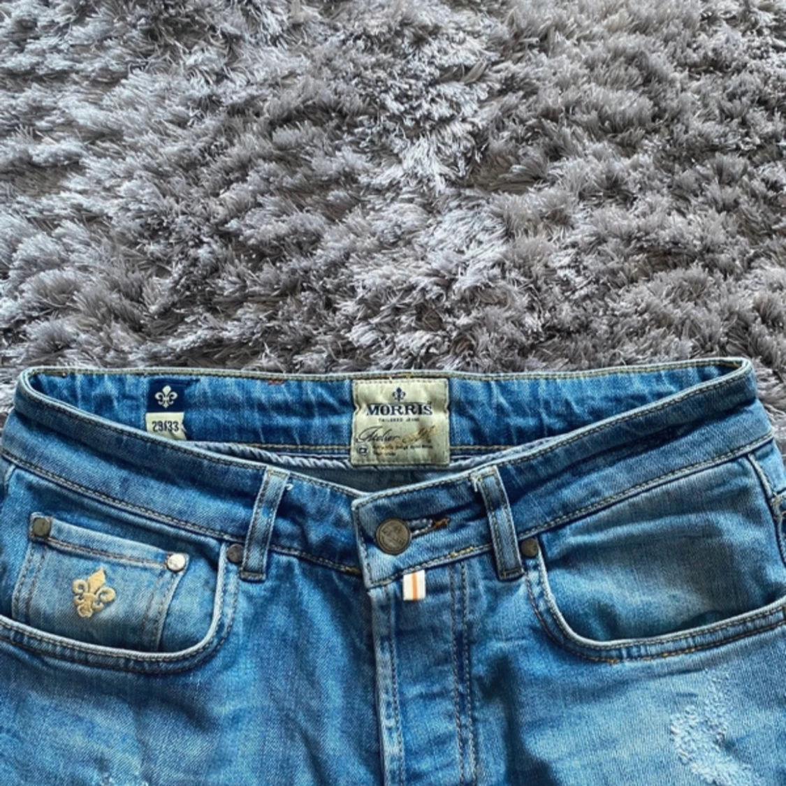 Snygga blå jeans från Morris med klassisk femficksdesign och diskreta slitningar. De har en knappgylf och en liten broderad detalj på myntfickan. Perfekta för en avslappnad stil.