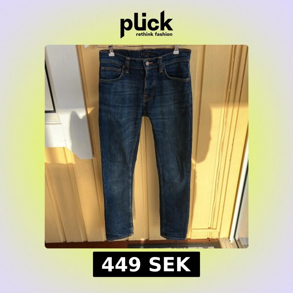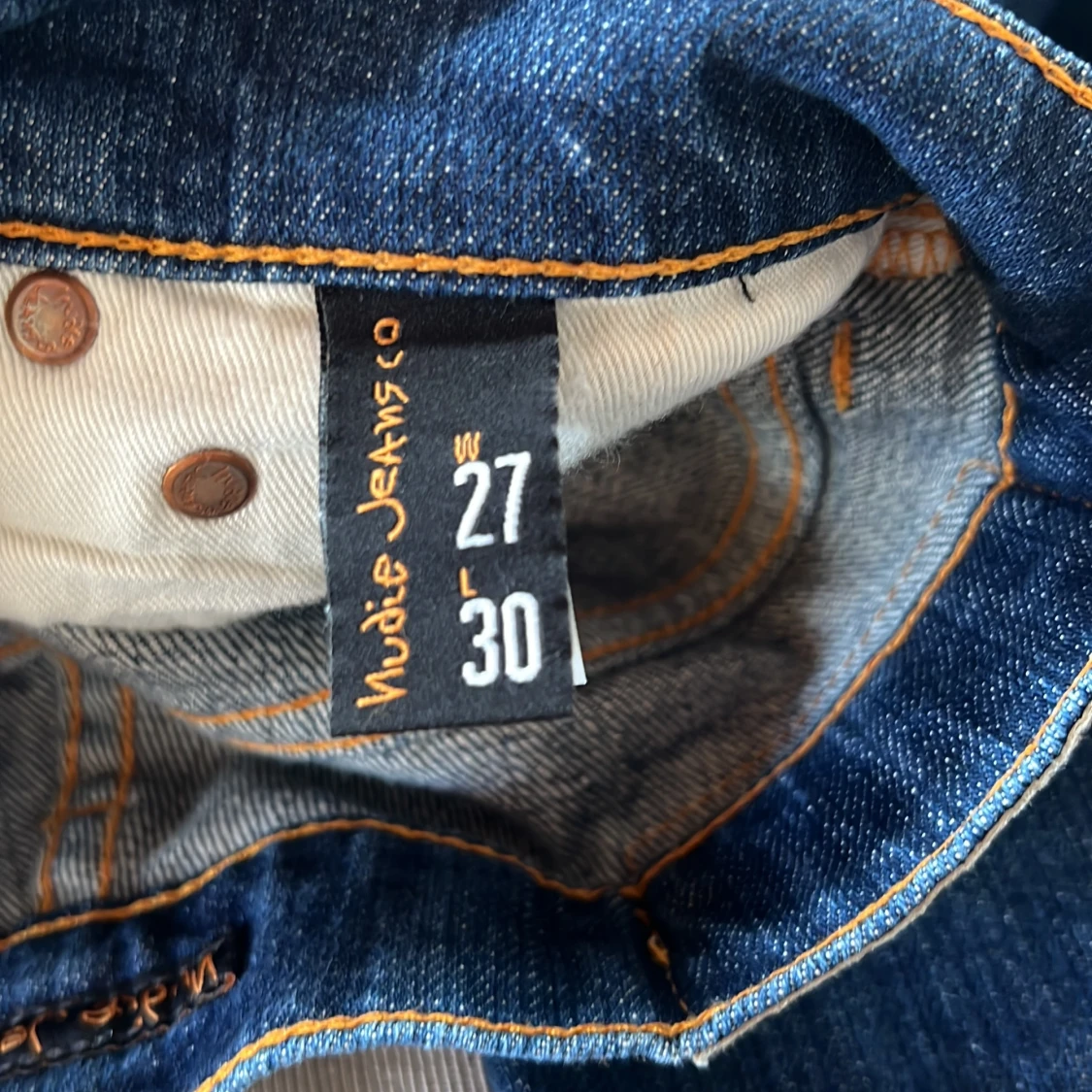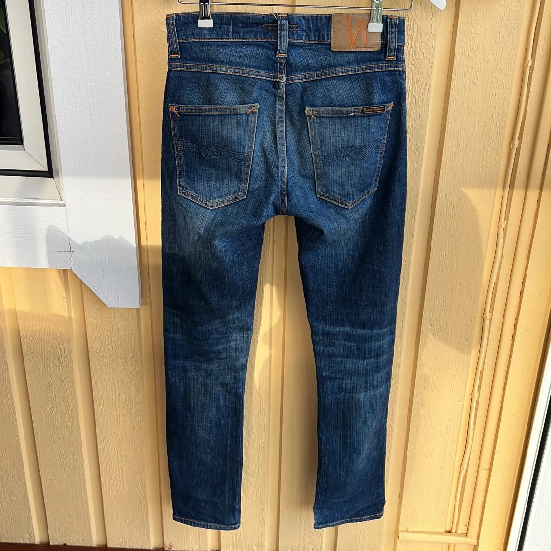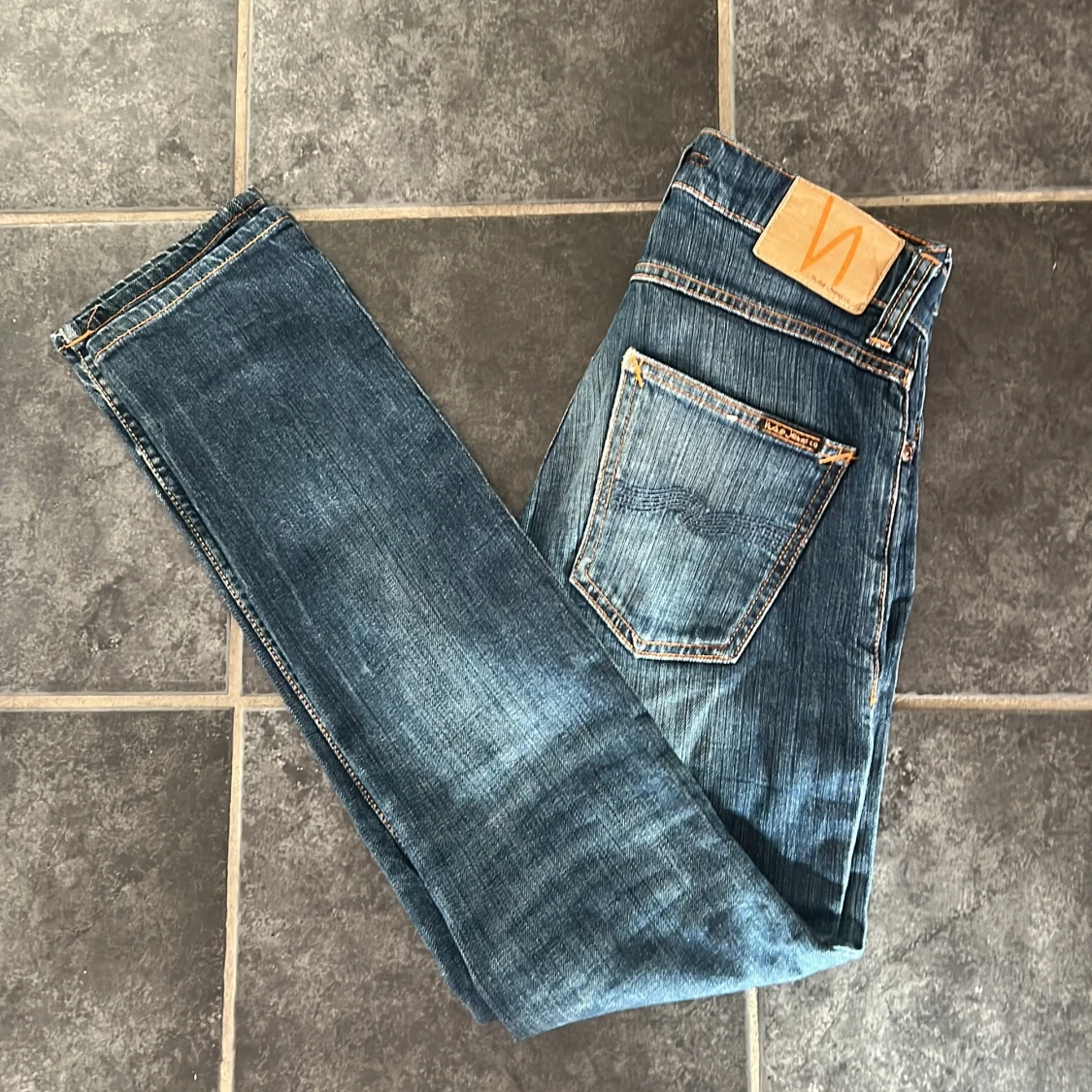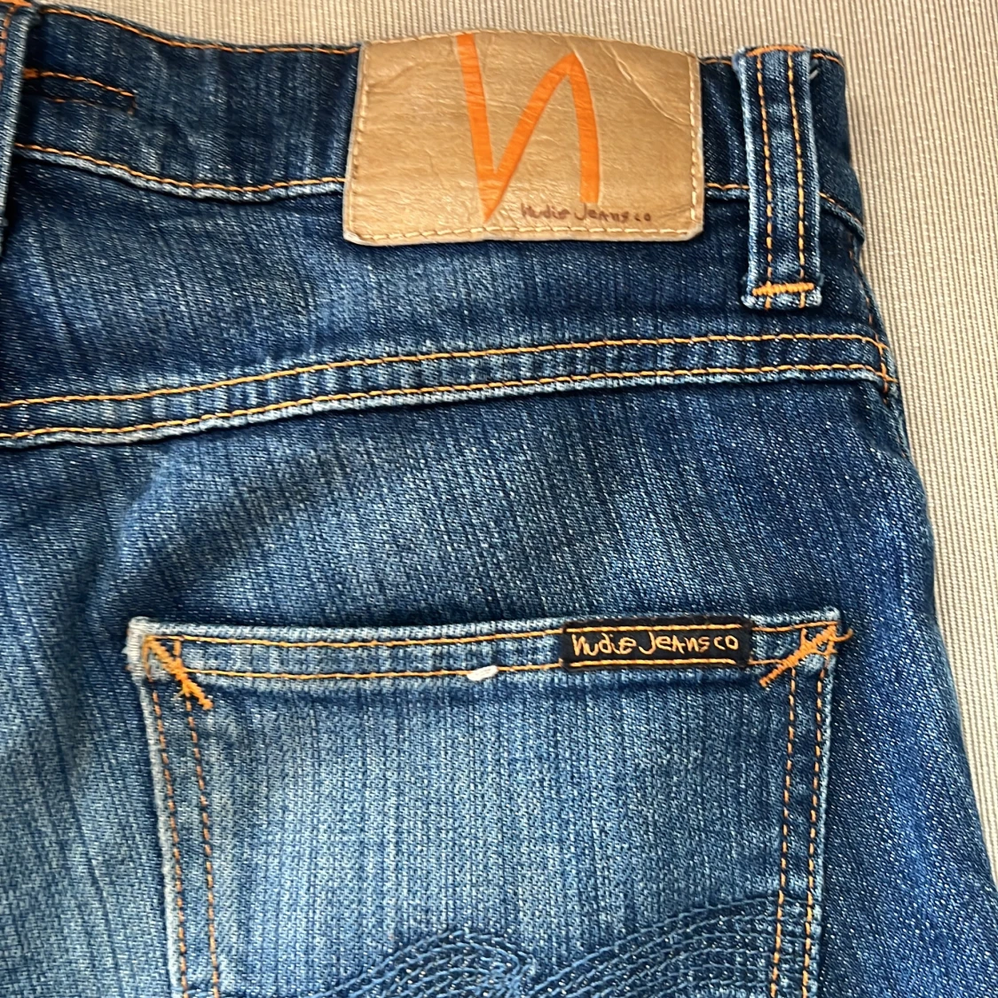 Säljer nu ett par snygga blå jeans från Nudie Jeans i klassisk femficksmodell. Jeansen har orangea kontrastsömmar, mellanblå tvätt och raka ben. Tillverkade i slitstarkt bomullstyg med Nudie-logga på bakfickan och patch i midjan. Perfekta för en avslappnad och stilren look.